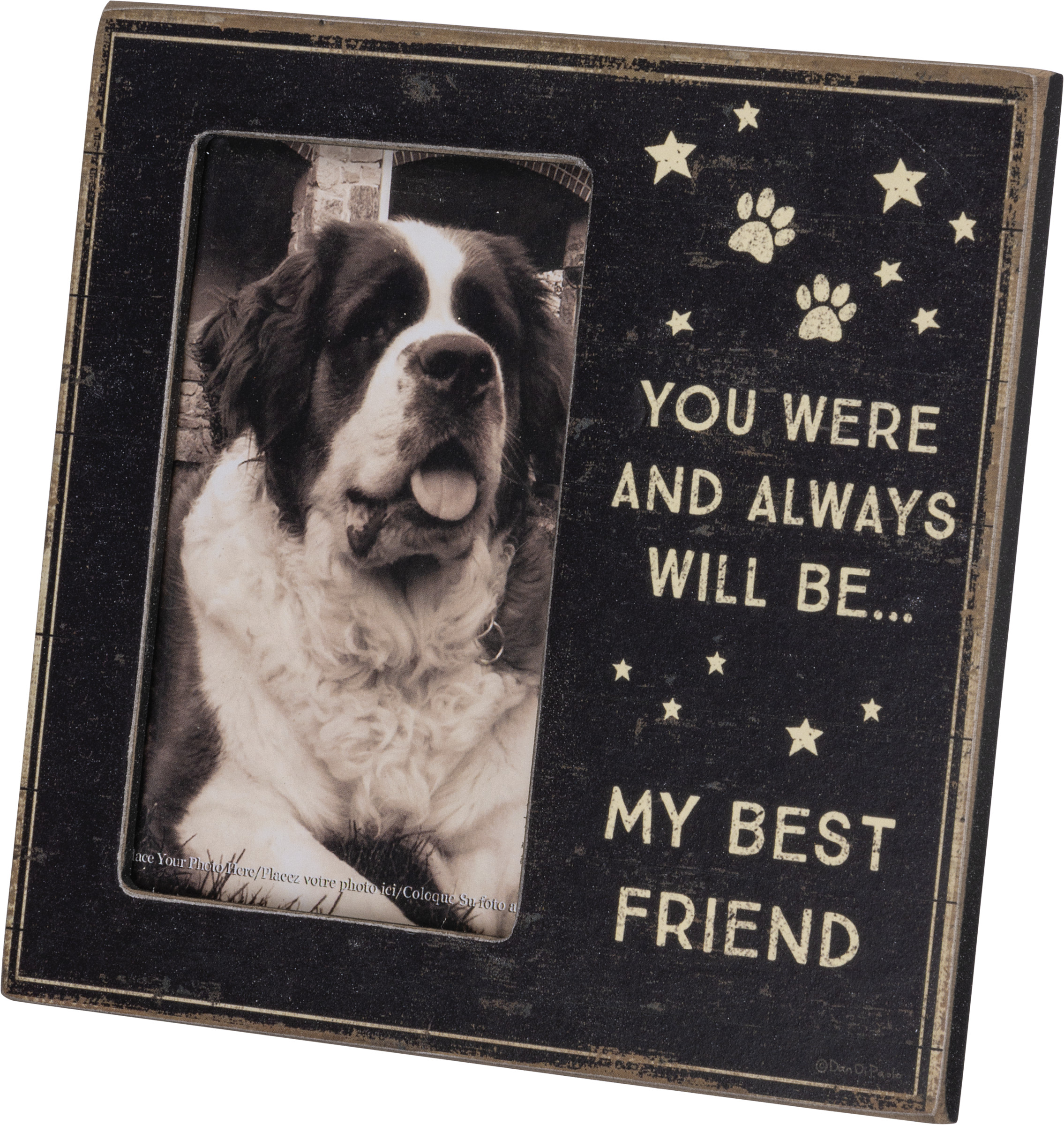 A wooden photo frame from our Pet Collection displaying a rustic style design of paw prints and stars with a heartwarming dog inspired sentiment that reads "You Were And Always Will Be… My Best Friend." Design features distressed details with coordinating black color on sides and back. Frame fits a 3 inch by 5 inch photo and can easily be replaced via clips on back. Our Best Friend Dog photo frame is easy to display using metal easel on the back to free-stand. A lovely pet-themed frame perfect for displaying favorite memories as everyday home décor.