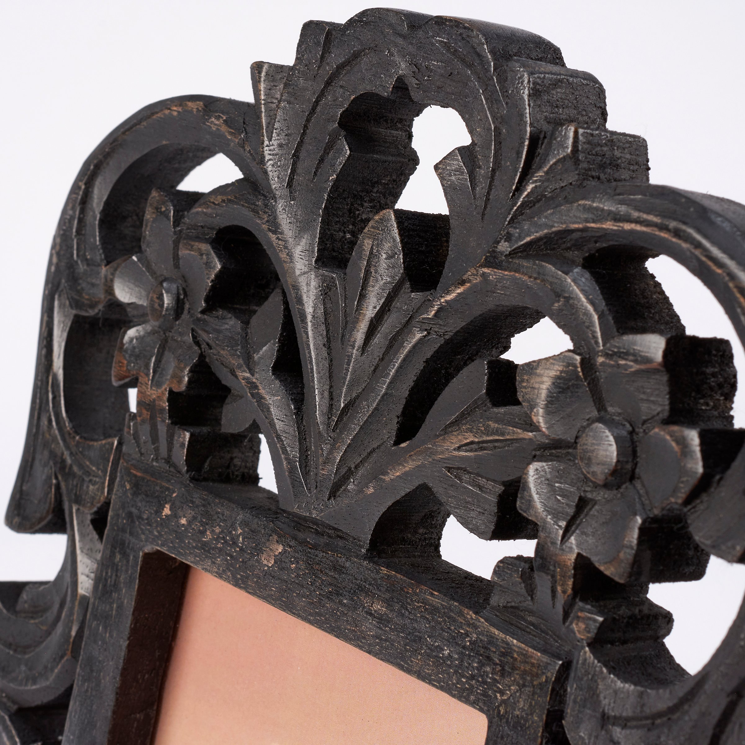 A decorative photo frame from our Moody Collection displaying an ornate filigree inspired black frame with distressed details and antique accents. Frame fits a 4 inch x 6 inch photo and can easily be replaced via clips on back. Our Black Filigree photo frame is easy to display using easel back to free-stand. A vintage home accent perfect for displaying favorite memories as everyday home décor.