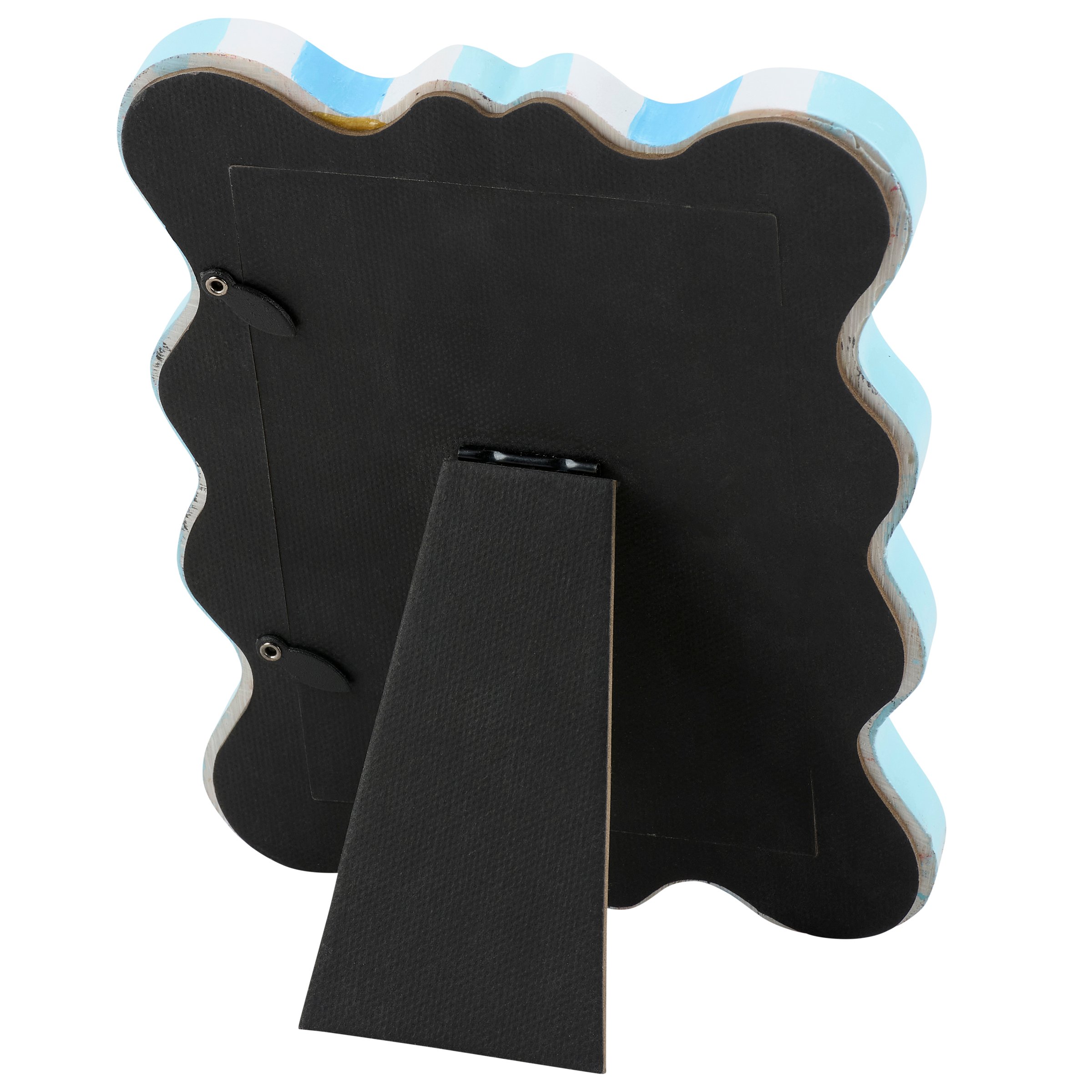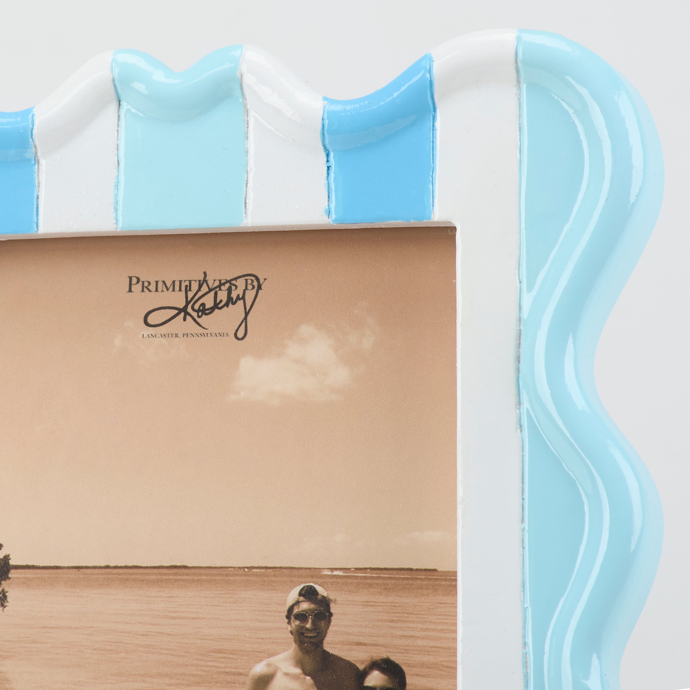 A photo frame from our Beach Collection displaying a blue ocean wave inspired stripe design with dimensional details. Beach photo frame fits a 4 inch by 6 inch photo that can easily be replaced via clips on back. Our Blue Wave photo frame is easy to display using easel back to free-stand. A stylish photo frame perfect for displaying favorite memories as beach themed home décor.