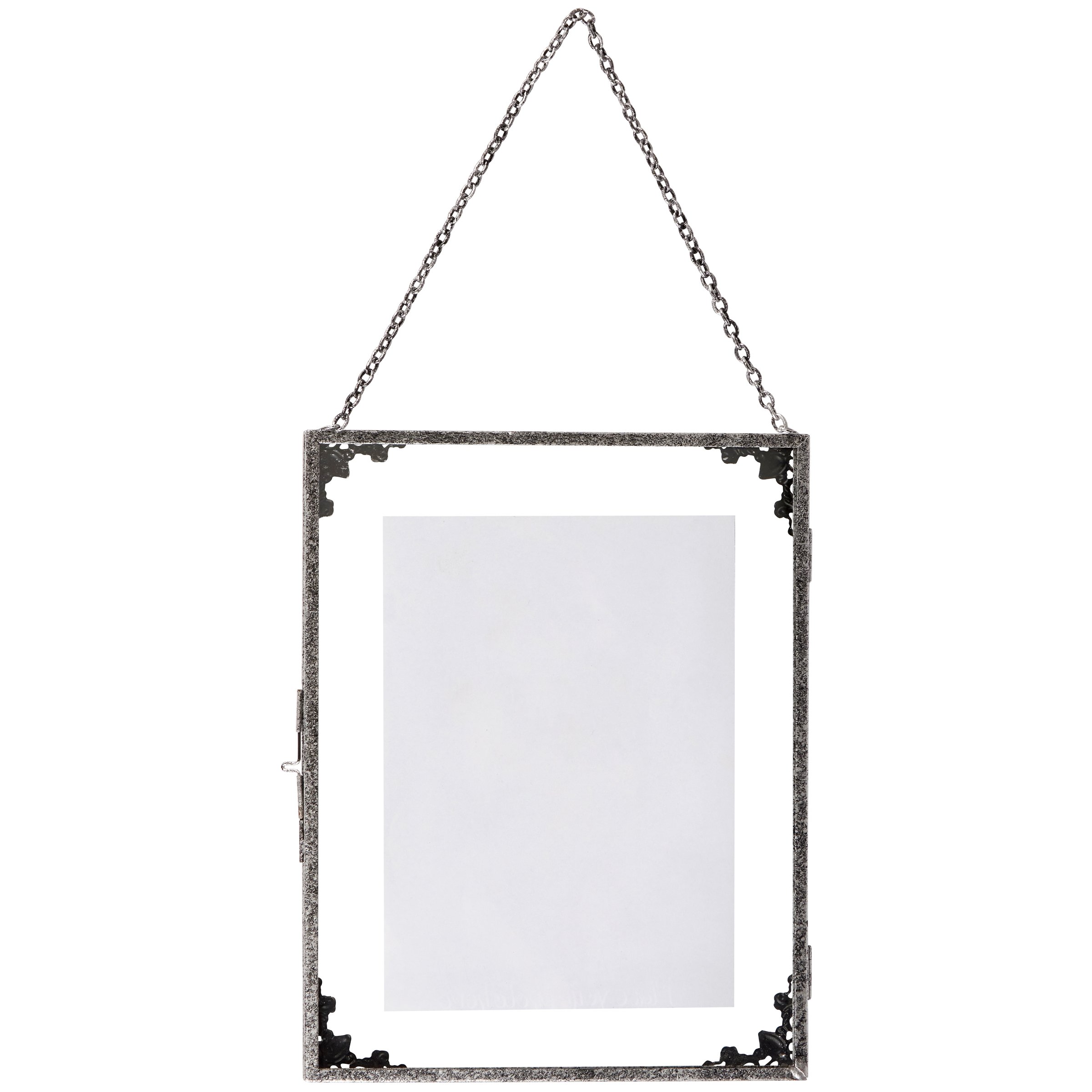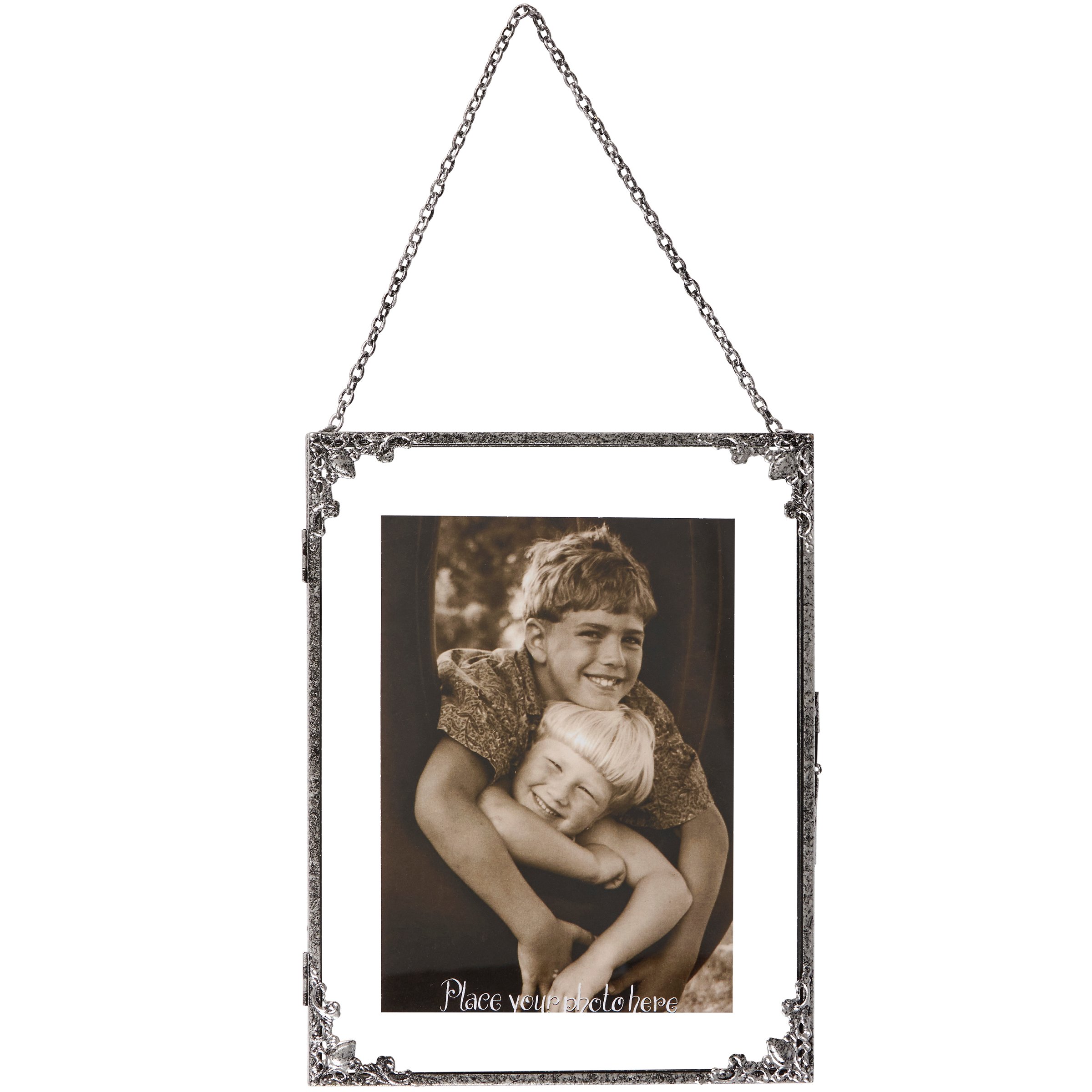 A decorative photo frame from our Moody Collection displaying an ornate silver metal frame with distressed details and antique accents around a glass pane. Frame opens to place a 5 inch x 7 inch photo via included adhesive, to give the appearance of floating within the frame with a clasp to secure closed. Our Floating photo frame is easy to display using via the attached chain hanger. A vintage home accent perfect for displaying favorite memories as everyday home décor.