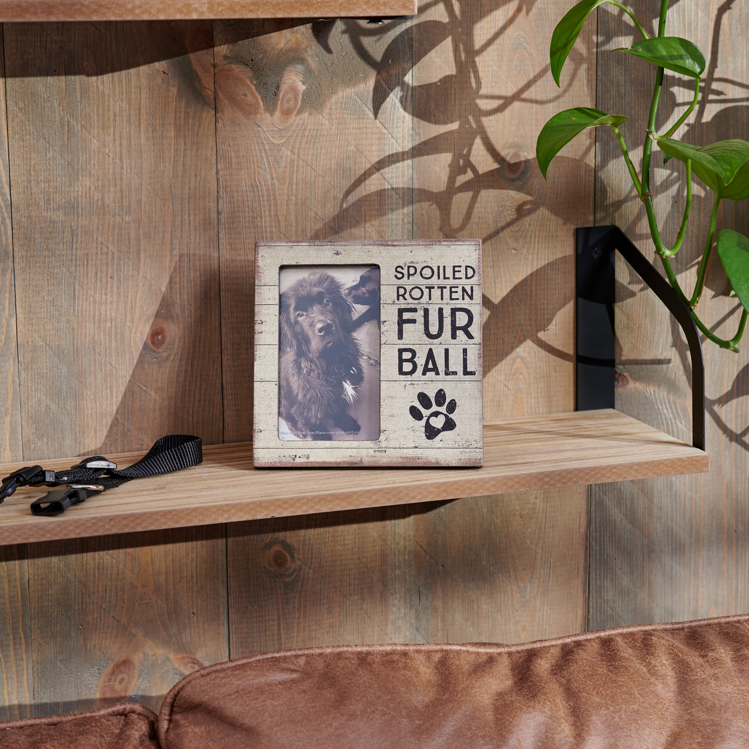 A wooden photo frame from our Pet Collection displaying a rustic style design of a paw print and heart with a fun pet-themed sentiment that reads "Spoiled Rotten Fur Ball." Design features coordinating black color on sides and back. Frame fits a 3 inch by 5 inch photo and can easily be replaced via clips on back. Our Fur Ball photo frame is easy to display using metal easel on the back to free-stand. A fun pet-themed frame perfect for displaying favorite memories as everyday home décor.