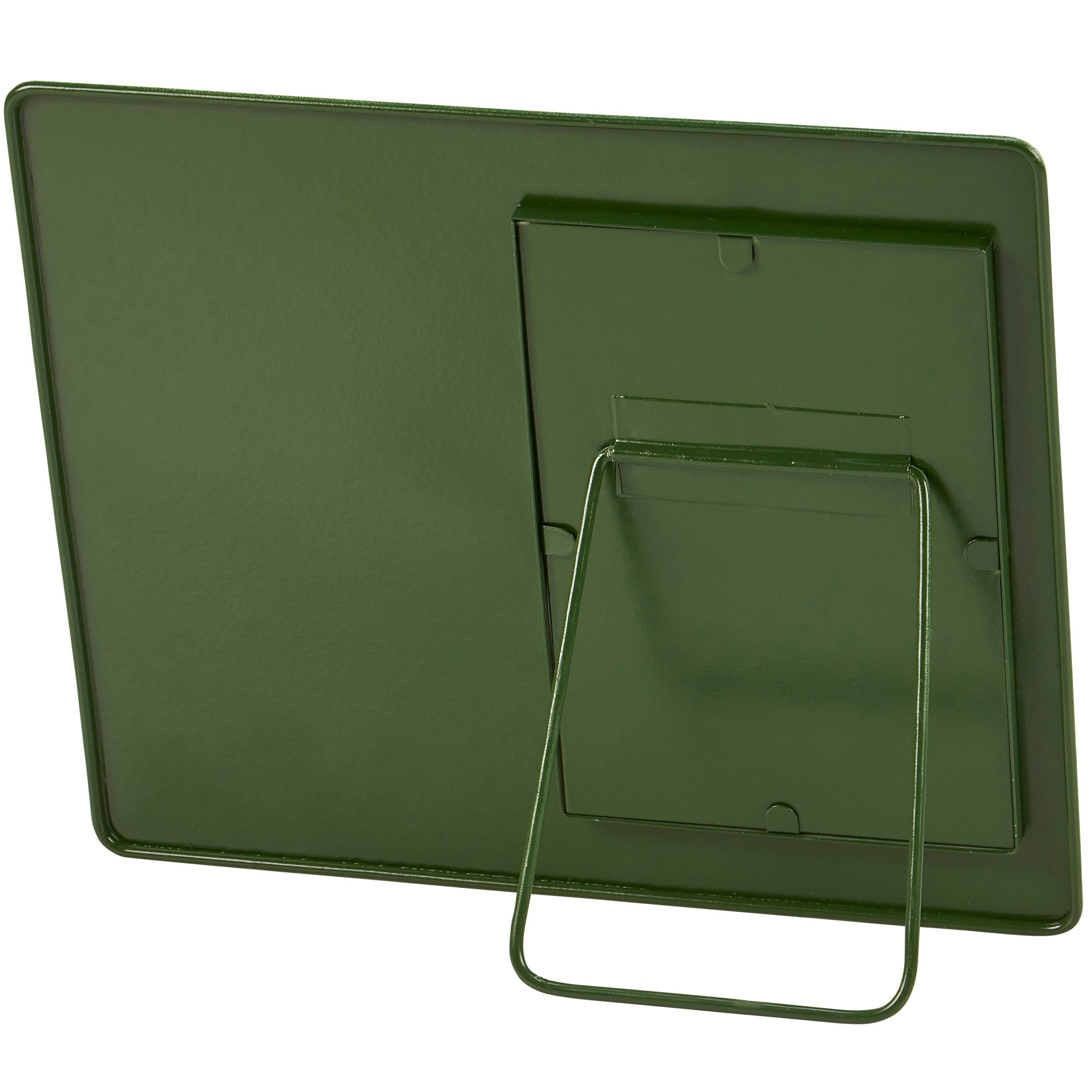 A metal photo frame from our Farmhouse Collection displaying a comforting hand painted scene of highland cows in a field replicated from original artwork painted onto burlap canvas, giving the art a unique depth and texture. Photo frame features coordinating green color on the back. Frame fits a 4 inch by 6 inch photo and can easily be replaced via clips on back. Our Highland Cows photo frame is easy to display using metal easel on back to free-stand. A farm-themed frame perfect for displaying favorite memories as everyday home décor.
