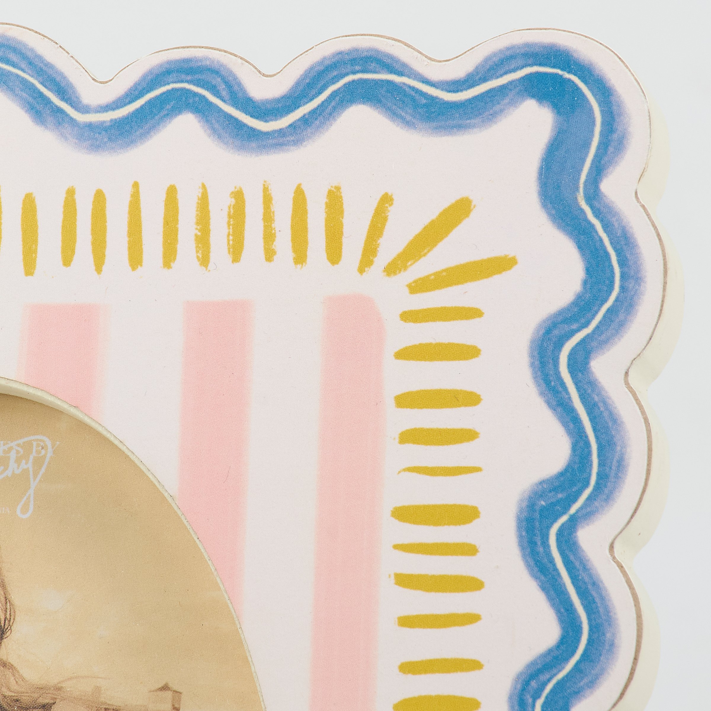 A photo frame from our Beach Collection featuring a wooden frame cut in the shape of the colorful graphics displayed inspired by Italian coastal style. Colorful designs are replicated from original hand illustrated artwork. Coastal photo frame fits a 4 inch by 6 inch oval photo that can easily be replaced via clips on back. Our Italian Coastal photo frame is easy to display using easel back to free-stand. A stylish photo frame perfect for displaying favorite memories as beach themed home décor.