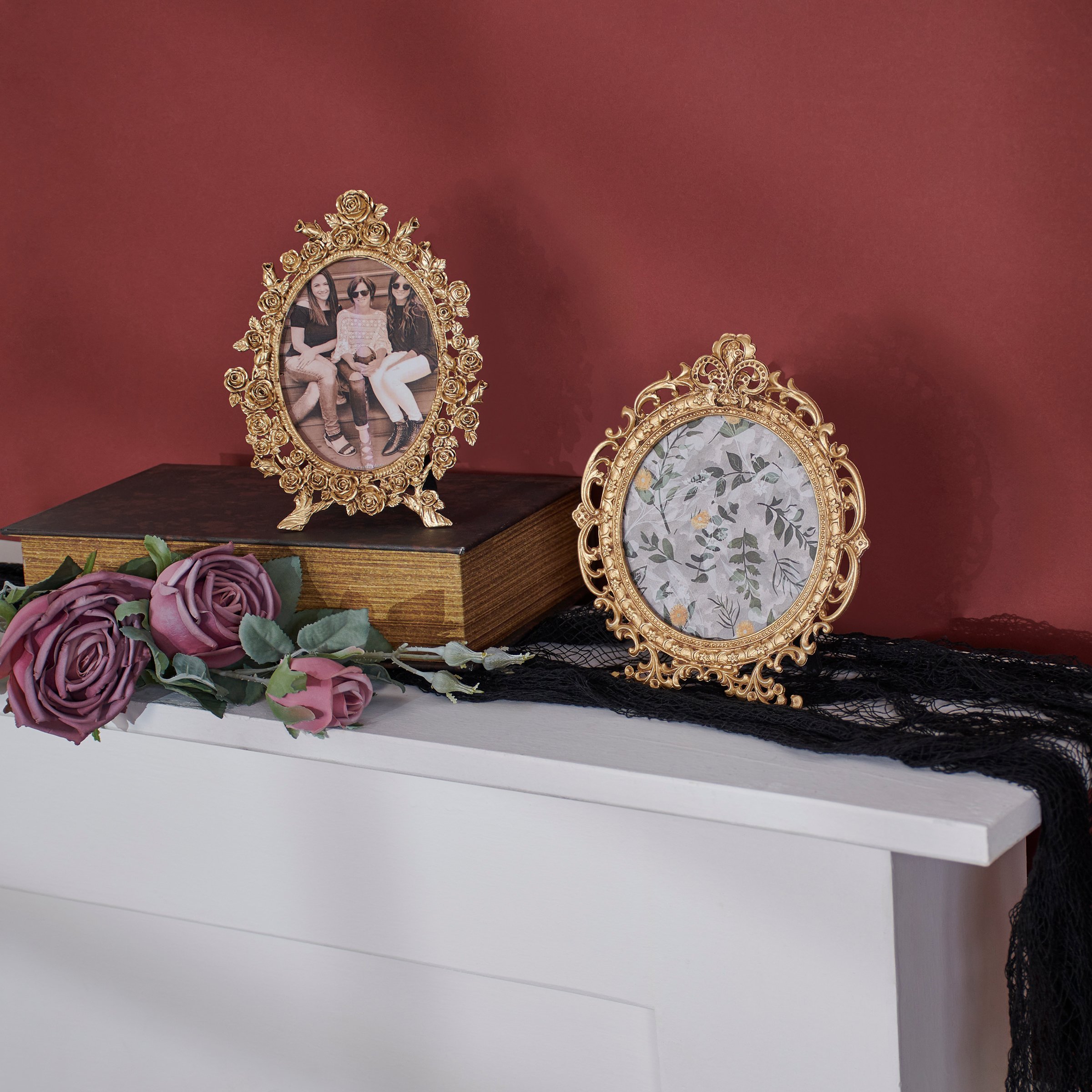 A decorative photo frame from our Moody Collection displaying an ornate filigree inspired gold color frame in an oval shape with distressed details and antique accents. Frame fits a 3 inch by 4.25 inch photo and can easily be replaced via clips on back. Our Oval Filigree photo frame is easy to display using easel back to free-stand. A vintage home accent perfect for displaying favorite memories as everyday home décor.