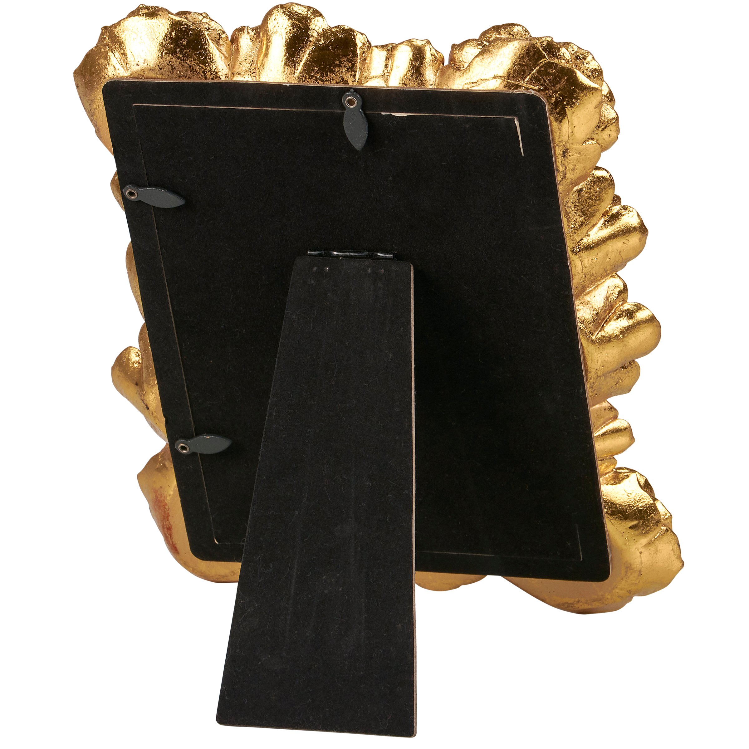 A decorative photo frame from our Moody Collection displaying metallic gold color frame made with various sculpted roses. Frame fits a 4 inch by 6 inch photo and can easily be replaced via clips on back. Our Roses photo frame is easy to display using easel back to free-stand. A vintage home accent perfect for displaying favorite memories as everyday home décor.