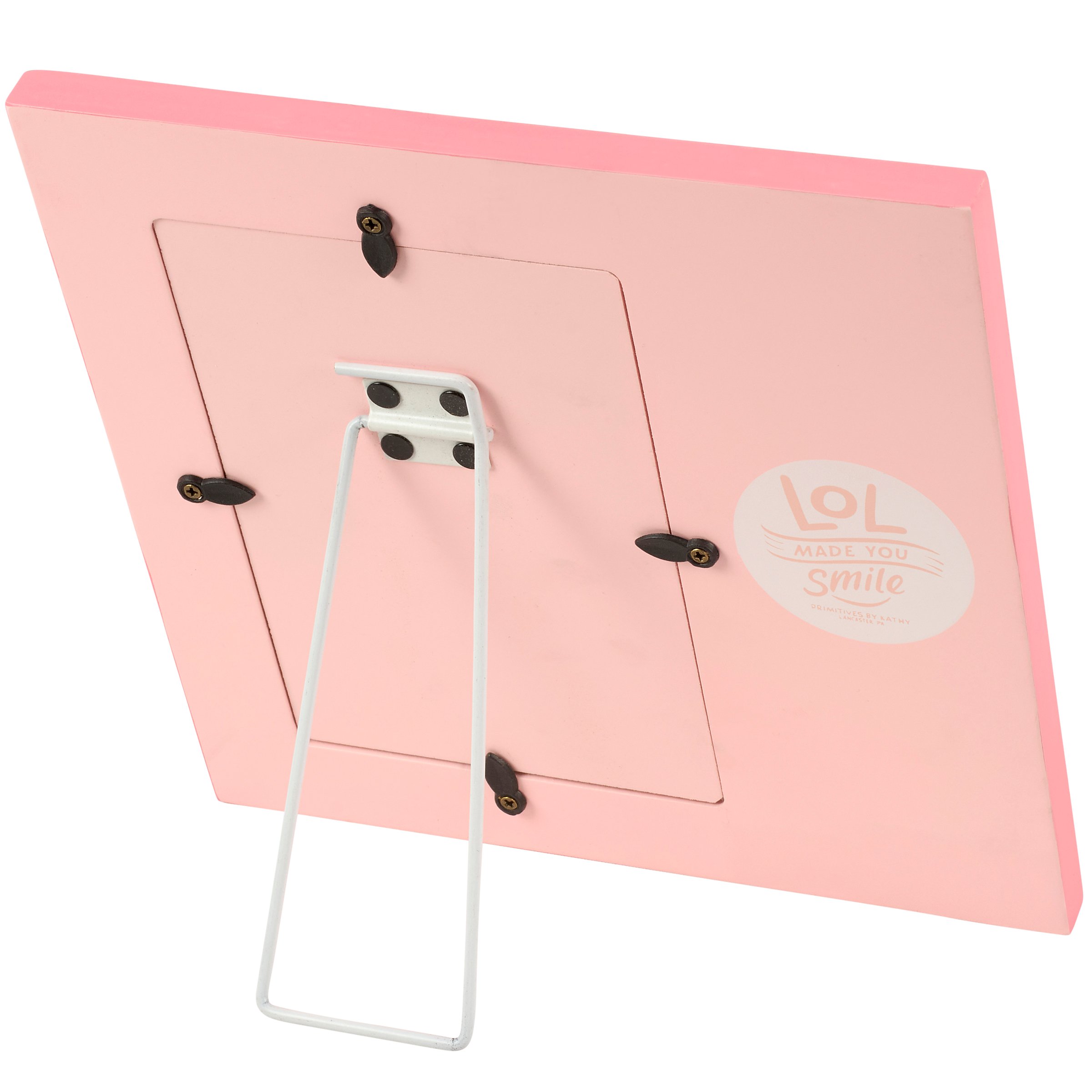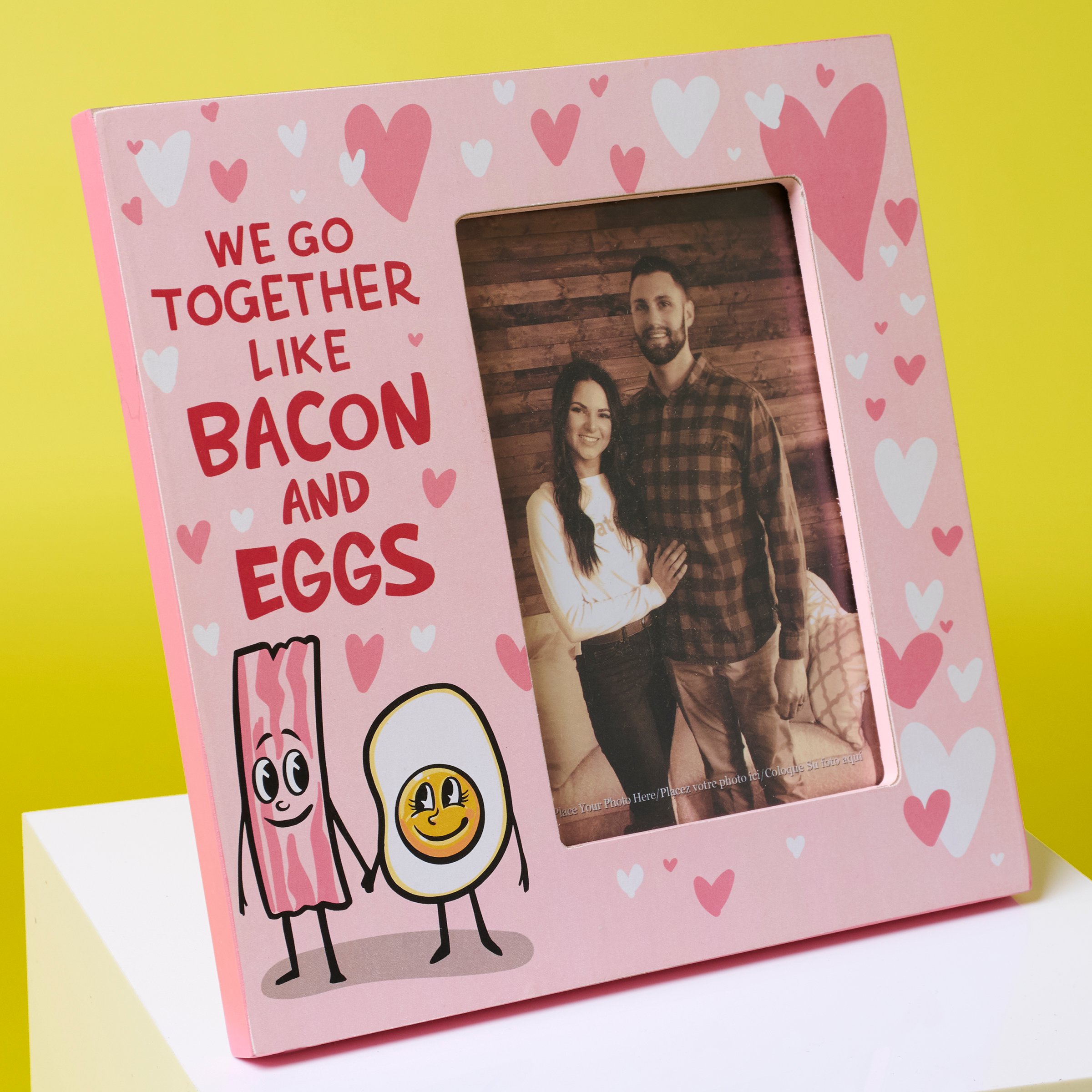 A wooden photo frame from our Valentine's Day Collection displaying a playful hand illustrated design of hearts and a bacon and egg couple with a fun food-themed sentiment that reads "We Go Together Like Bacon And Eggs." Photo frame features coordinating pink color on sides and back. Frame fits a 4 inch by 6 inch photo and can easily be replaced via clips on back. Our Together Like Bacon And Eggs photo frame is easy to display using metal easel on the back to free-stand. A food-themed gift for both friends and partners on Valentine's Day or everyday moments perfect for displaying favorite memories as home décor.