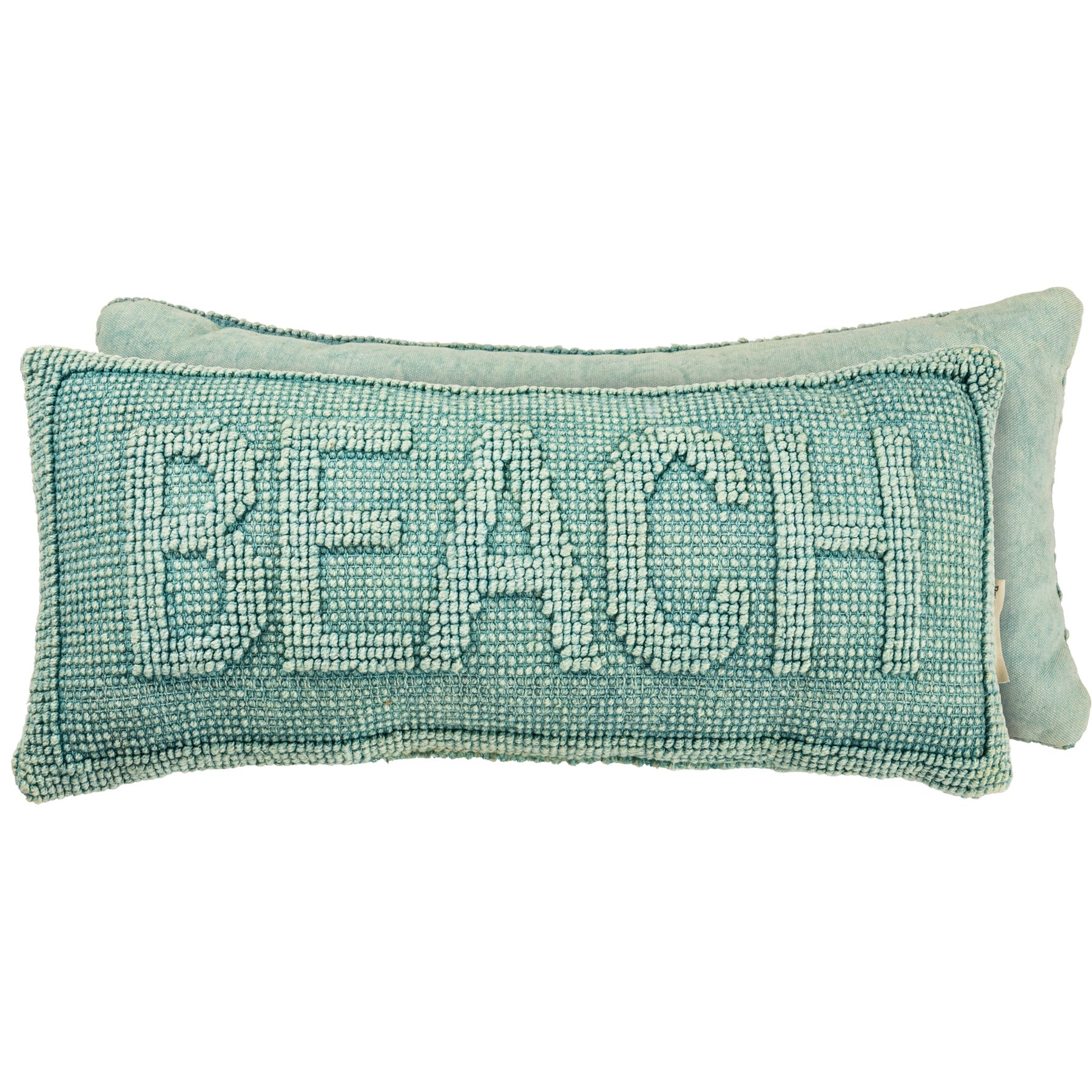 A knobby pillow from our Beach Collection with a front "Beach" sentiment on cotton, and a canvas back. Polyester filling. Shipped vacuum-sealed for protection and storage. This Beach pillow includes a zipper to easily remove and clean cover.