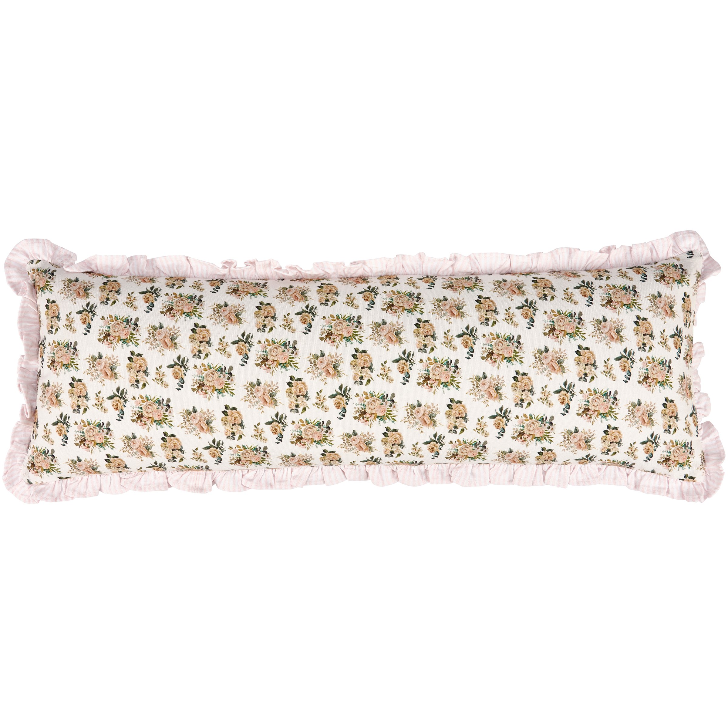 A double-sided cotton pillow from ourĀ Watercolor Collection displaying a pattern of cabbage rose bouquets with a coordinating light pink stripe cotton-linen trim. Cabbage rose designs are replicated from original art hand painted in a unique watercolor style. Pillow features a zipper to easily remove and clean machine-washable pillow cover. Our Cabbage Rose Bouquet pillow contains polyester filling and is shipped vacuum-sealed for protection and storage. A stylish home accent perfect for any room.
