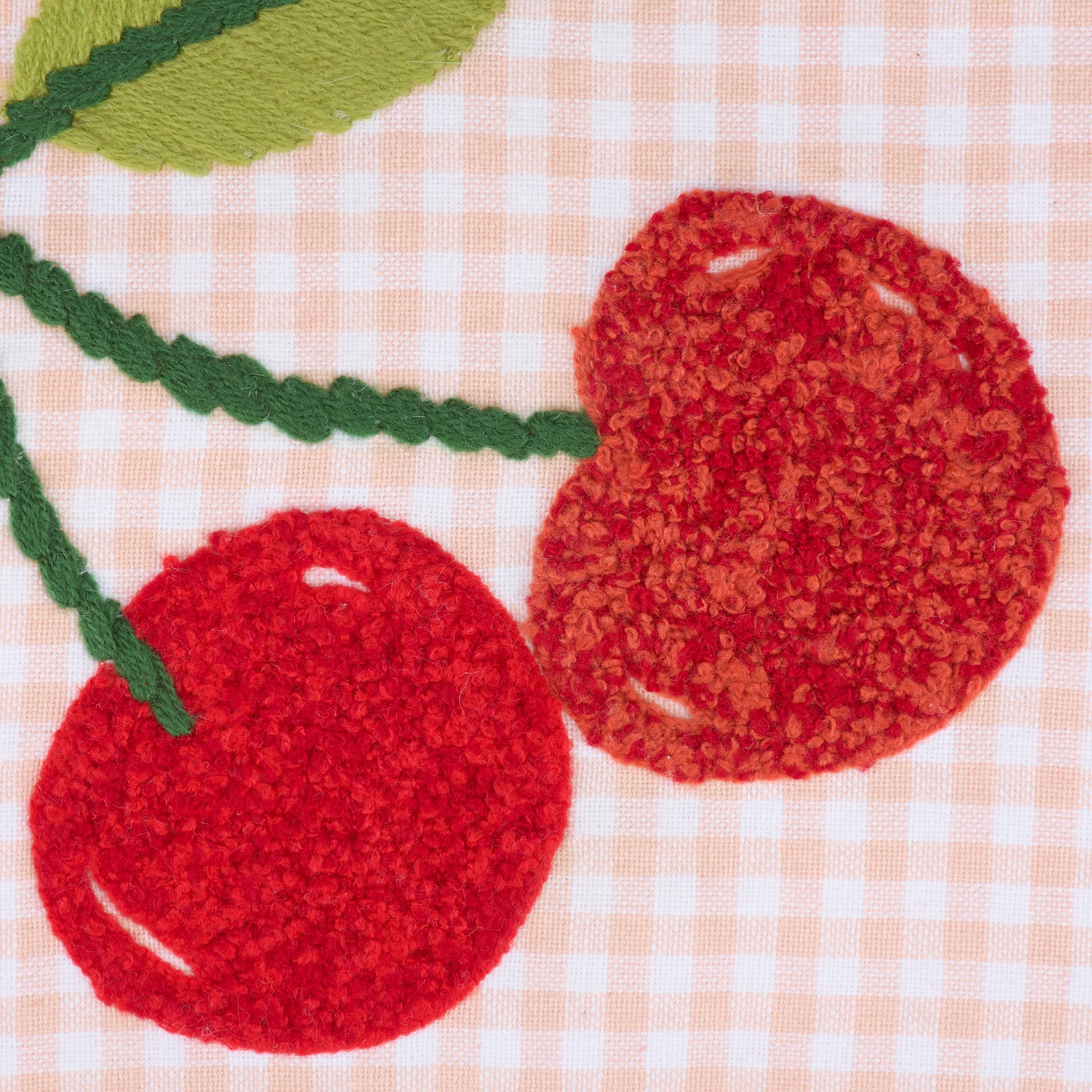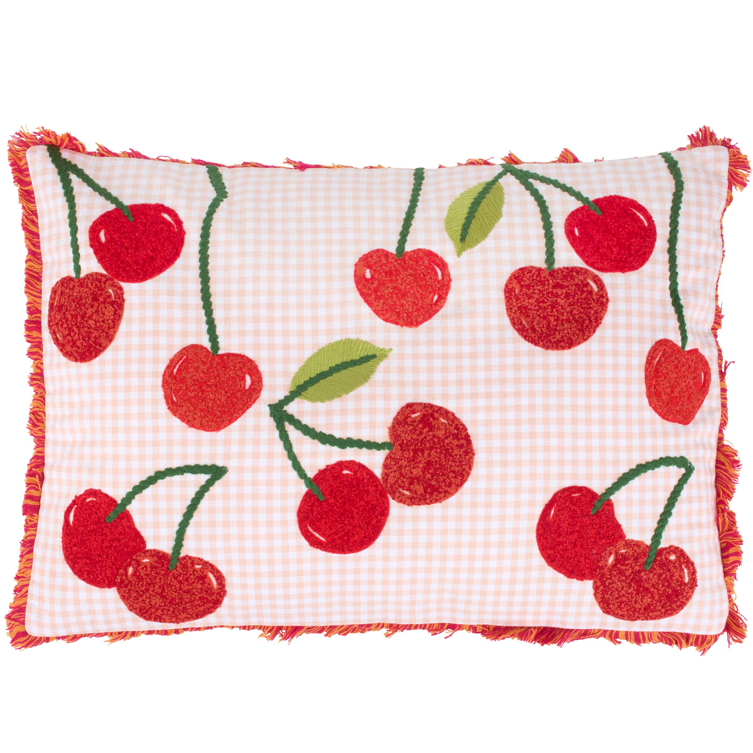 A decorative pillow from our Patriotic Collection displaying a cherries inspired design that features a gingham pattern with cherries made using embroidered cotton in various textures and a coordinating fringe trim. Our Cherry Stem pillow features a zipper to easily remove and clean machine-washable pillow cover. Americana pillow contains polyester filling and is shipped vacuum-sealed for protection and storage. A cherry themed home accent perfect for adding vintage Americana style to any room.