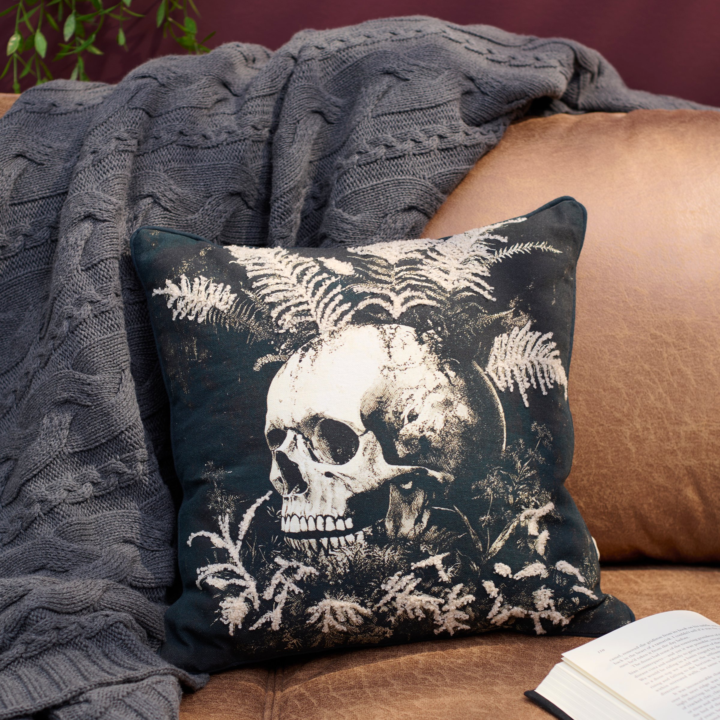 A cotton decorative pillow from our Halloween Collection displaying a moody skull design surrounded by plants with raised cotton accents for added texture. Skull pillow features coordinating black color on back with black piping trim. Our Dark Plant Skull pillow includes a zipper to easily remove and clean the machine-washable pillow cover. Halloween pillow contains polyester filling and is shipped vacuum-sealed for protection and storage. A moody Halloween home accent perfect for adding seasonal style to any room.