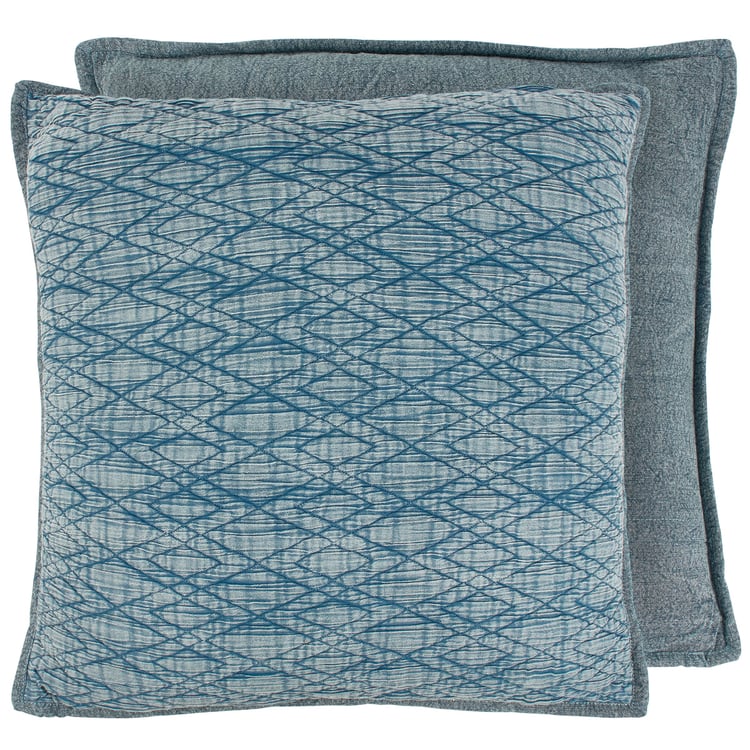 A decorative cotton throw pillow from our Home Collection displaying a quilted fabric design in a vintage blue color palette with a diamond pattern stitched throughout and stonewashed blue cotton on the back. Our Diamond Blue pillow includes a zipper to easily remove and clean machine-washable pillow cover. Quilted pillow contains polyester filling and is shipped vacuum-sealed for protection and storage. An everyday home accent that adds vintage style to any room.