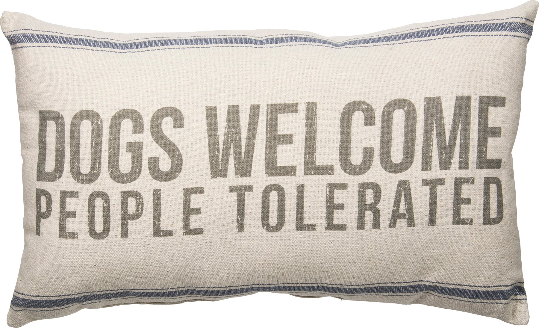 A decorative cotton throw pillow displaying woven rustic blue stripes with a distressed dog inspired sentiment that reads "Dogs Welcome - People Tolerated." Our Dogs Welcome pillow includes a zipper to easily remove and clean machine-washable pillow cover. Rustic pillow contains polyester filling and is shipped vacuum-sealed for protection and storage. A rustic pet-themed home accent perfect for adding style to any room.