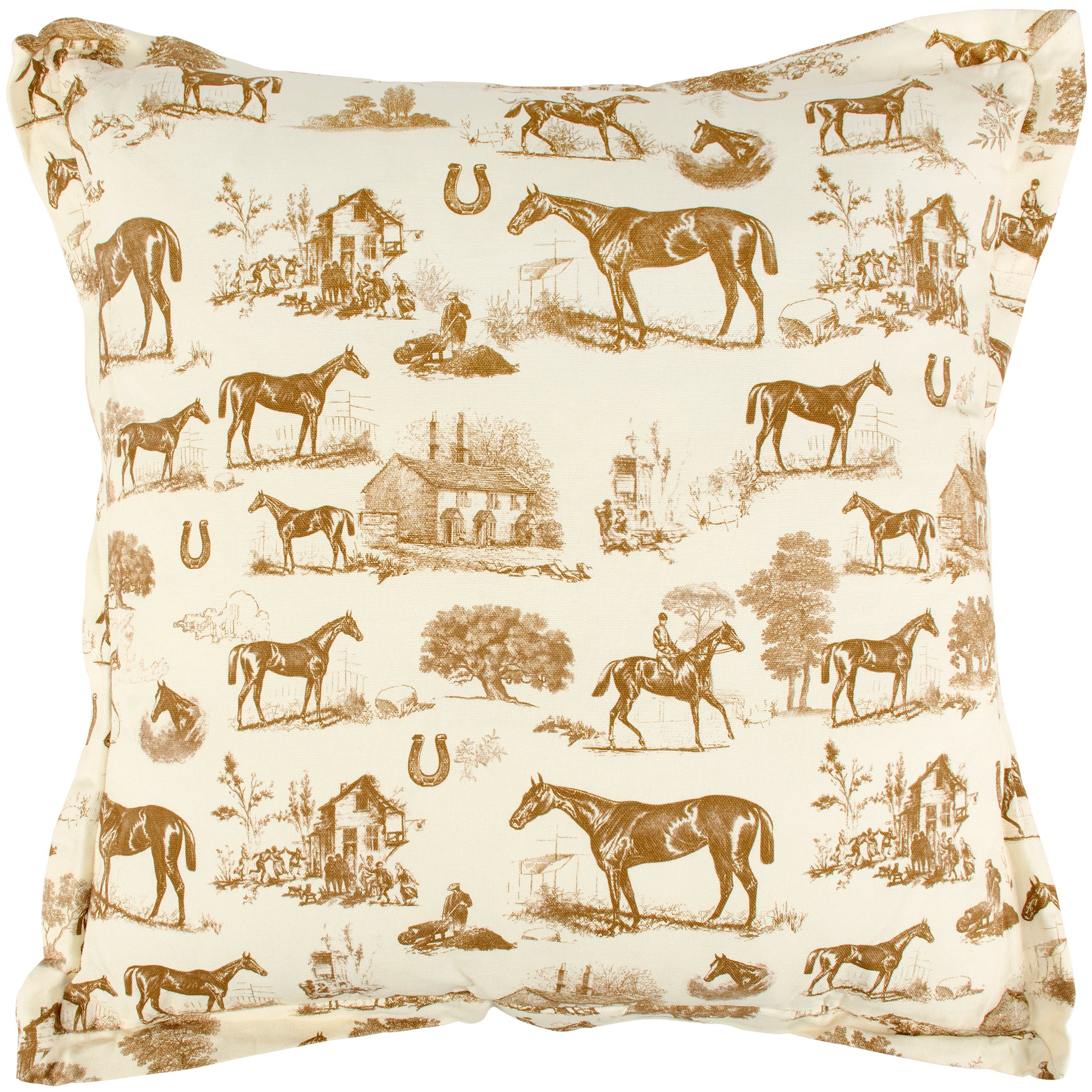 A decorative pillow from our Preppy Heritage Collection displaying a toile pattern of horse inspired designs inspired by vintage equestrian home décor with flange edging and coordinating brown color on the back. Our Horse Toile pillow includes a zipper to easily remove and clean machine-washable pillow cover. Equestrian pillow contains polyester filling and is shipped vacuum-sealed for protection and storage. A horse themed home accent perfect for adding vintage style to any room.