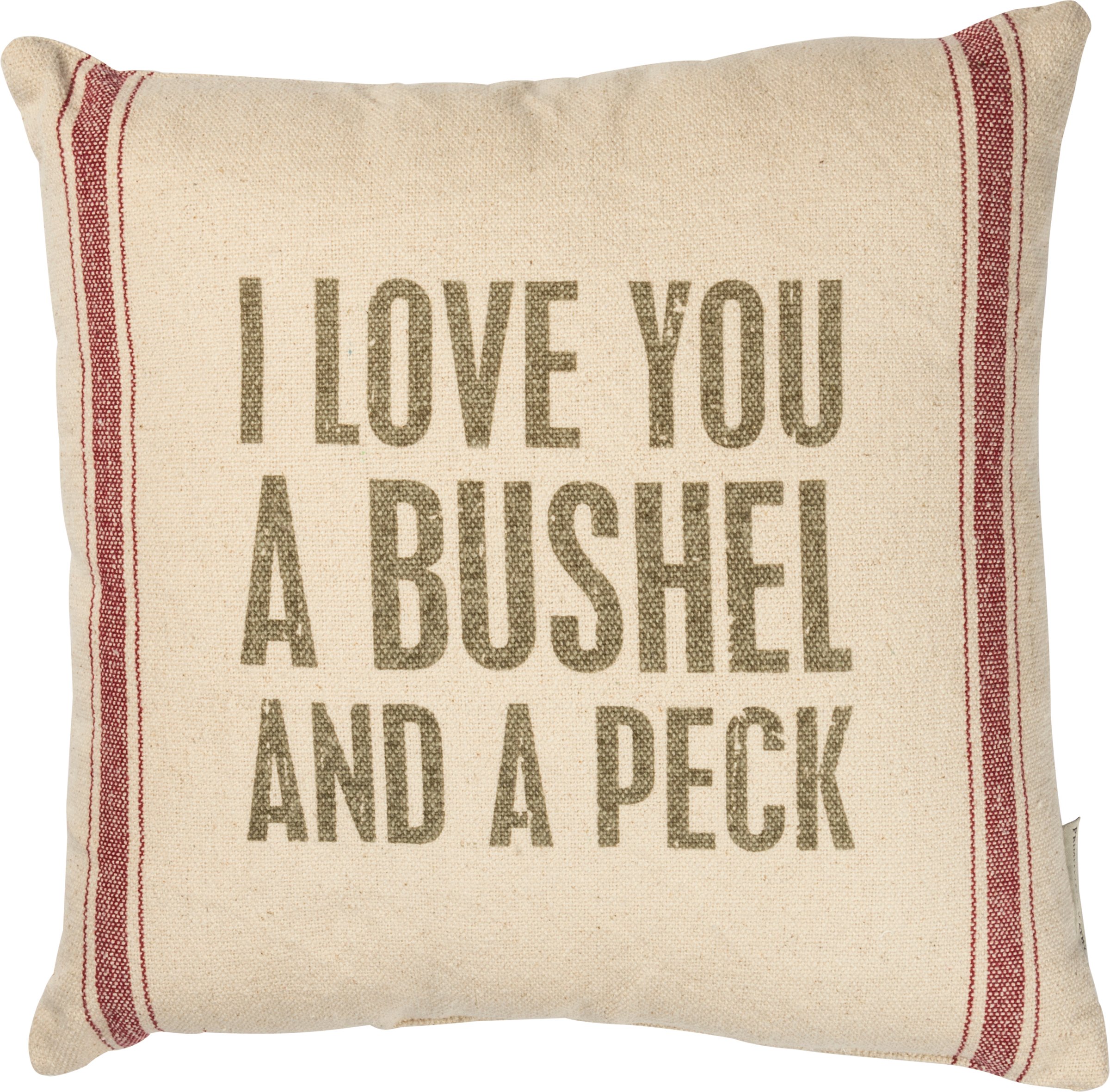 A box sign style cotton pillow featuring a distressed "I Love You A Bushel And A Peck" sentiment and red striped trim accents on a cream base. Polyester filling. Includes a zipper to easily remove and clean cover. Shipped vacuum-sealed for protection and storage.