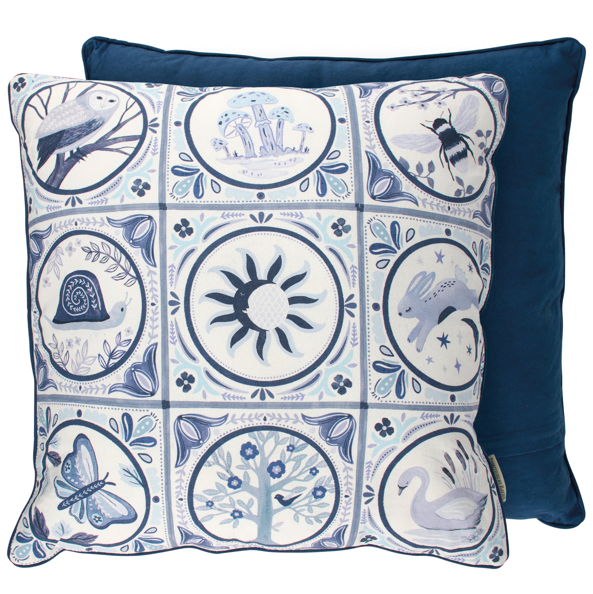 A decorative pillow from our Home Collection displaying tile inspired designs featuring various nature scenes in a calming indigo color palette with coordinating piping trim and blue color on the back. Each tile design is replicated from original hand illustrated art. Our Indigo Tile pillow includes a zipper to easily remove and clean machine-washable pillow cover. Indigo pillow contains polyester filling and is shipped vacuum-sealed for protection and storage. A nature themed home accent perfect for adding indigo style to any room.
