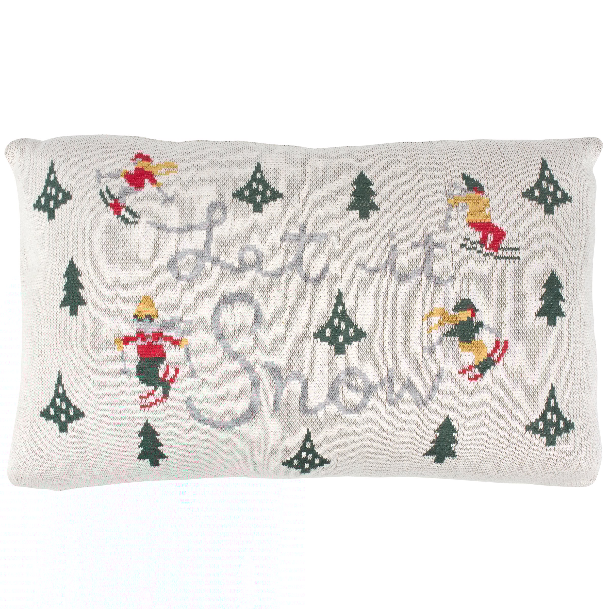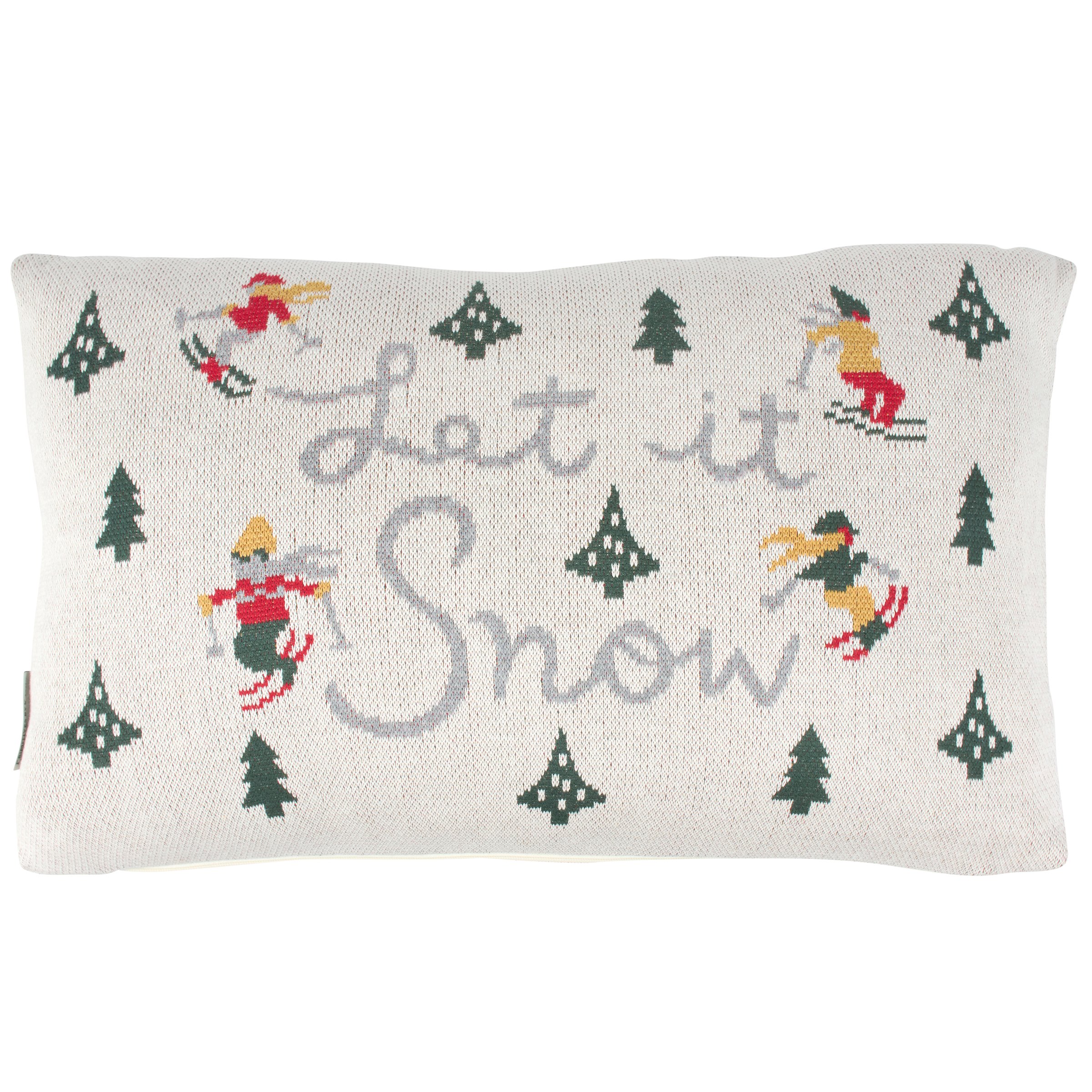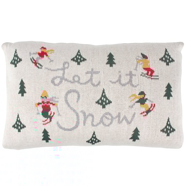 A decorative pillow from our Ski Lodge Collection featuring a double-sided woven design displaying skiers and trees around a "Let It Snow" sentiment. Our Let It Snow Skiers pillow features a zipper to easily remove and clean machine-washable pillow cover. Ski pillow contains polyester filling and is shipped vacuum-sealed for protection and storage. A ski themed home accent perfect for adding personal style to any room.