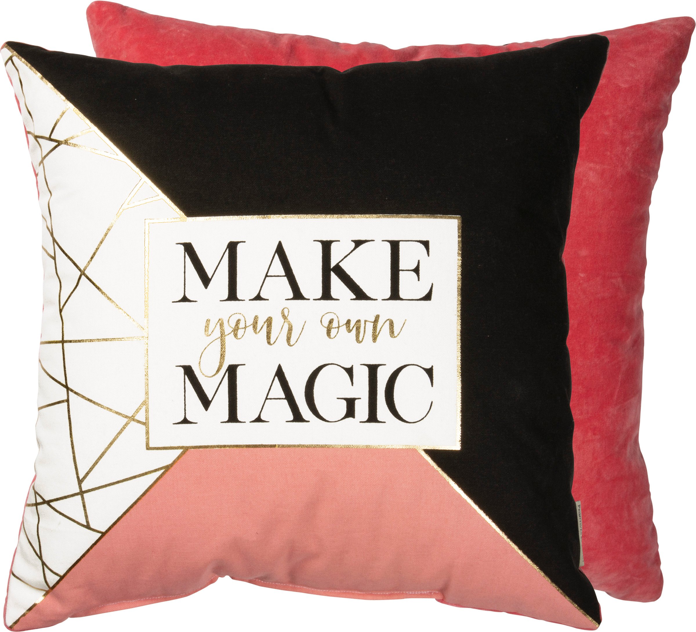 A square cotton front pillow with velvet back and piping in complementing colors. Features "Make Your Own Music" sentiment with geometric pattern and gold foil accents. Polyester filling. Shipped vacuum-sealed for protection and storage. Complements well with other pieces in collection to create a cohesive display.