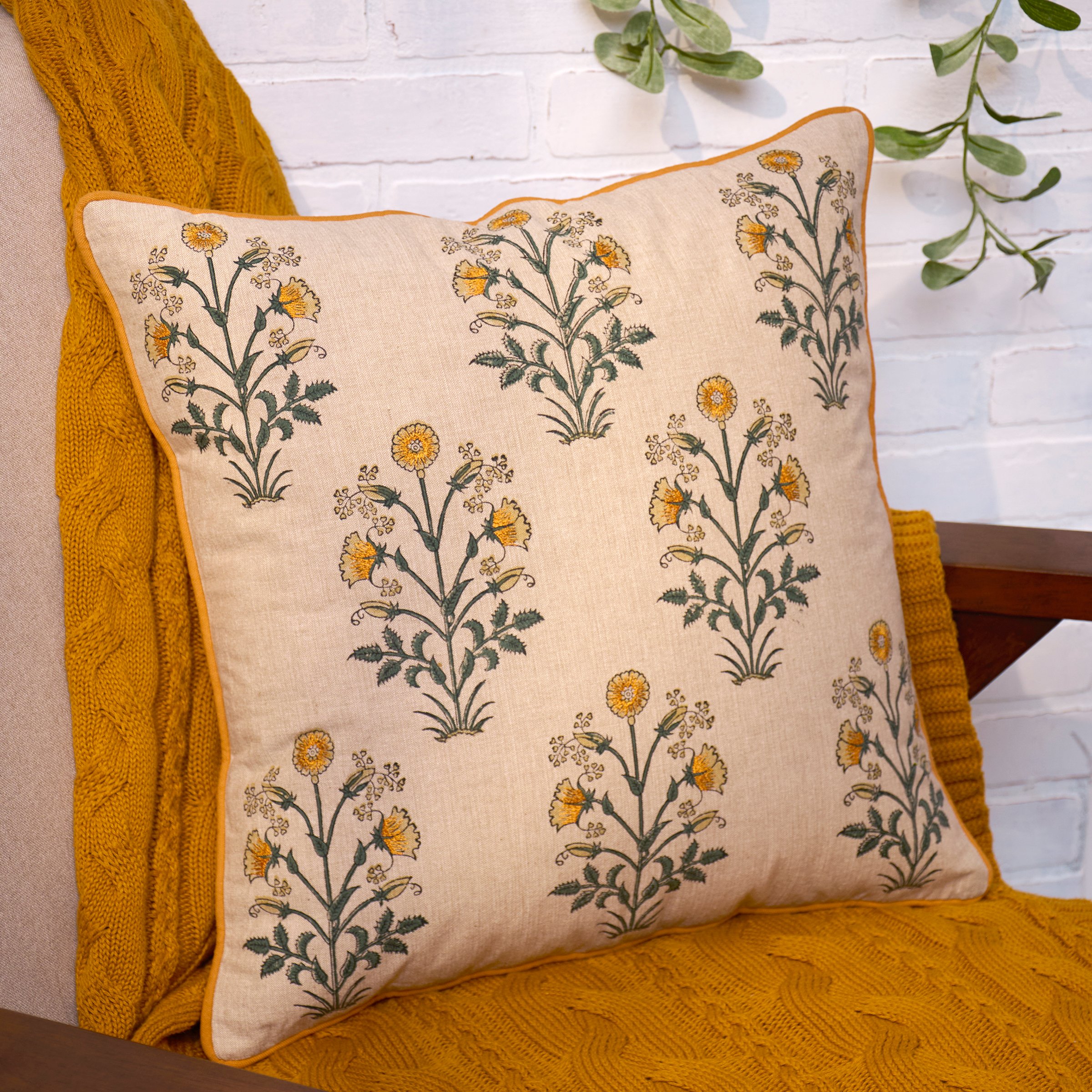 A decorative pillow from our Cottagecore Collection featuring a vintage pattern of marigolds with embroidered details for added texture. Our Marigolds pillow features a zipper to easily remove and clean machine-washable pillow cover. Cottage pillow contains polyester filling and is shipped vacuum-sealed for protection and storage. A rustic home accent perfect for adding cottage style to any room.
