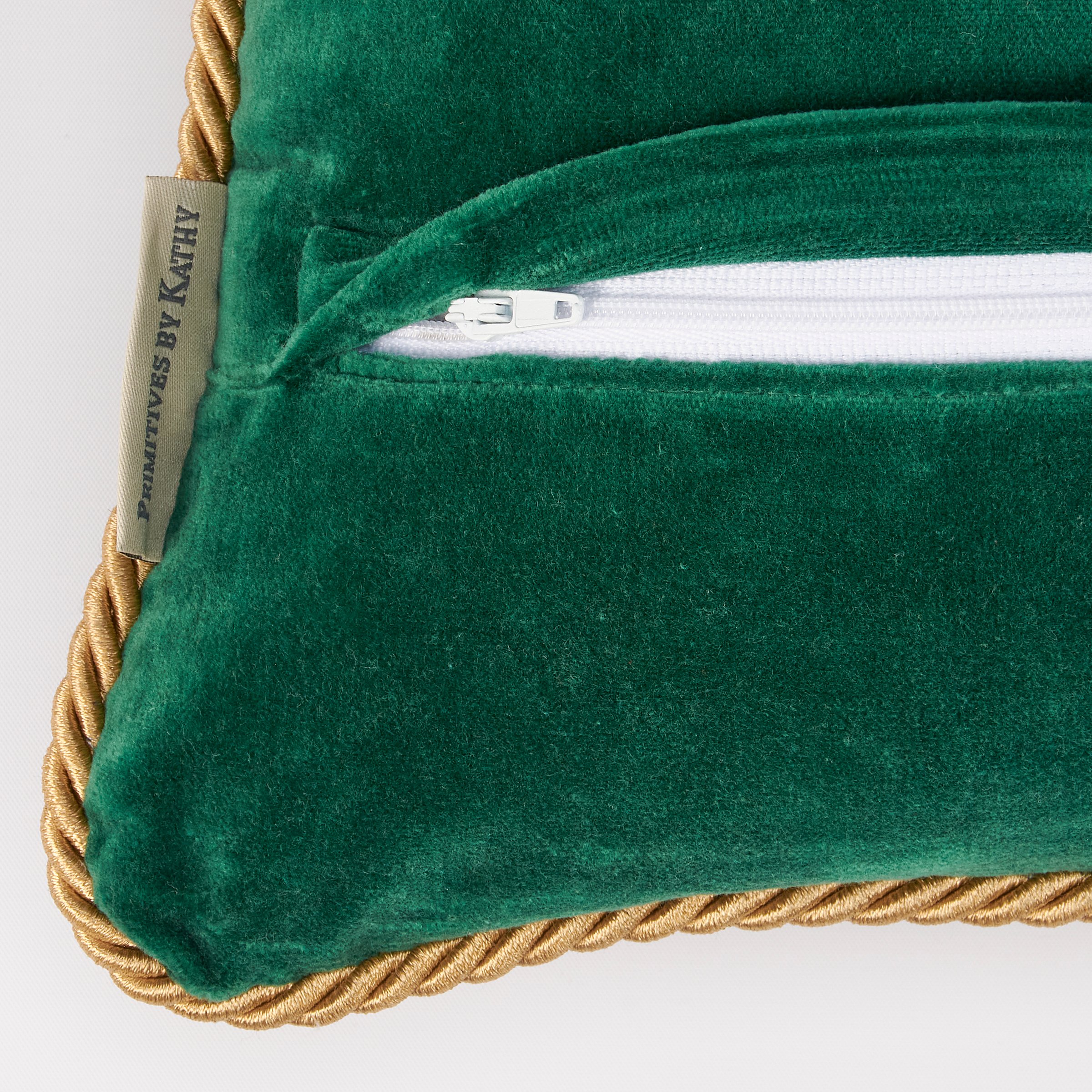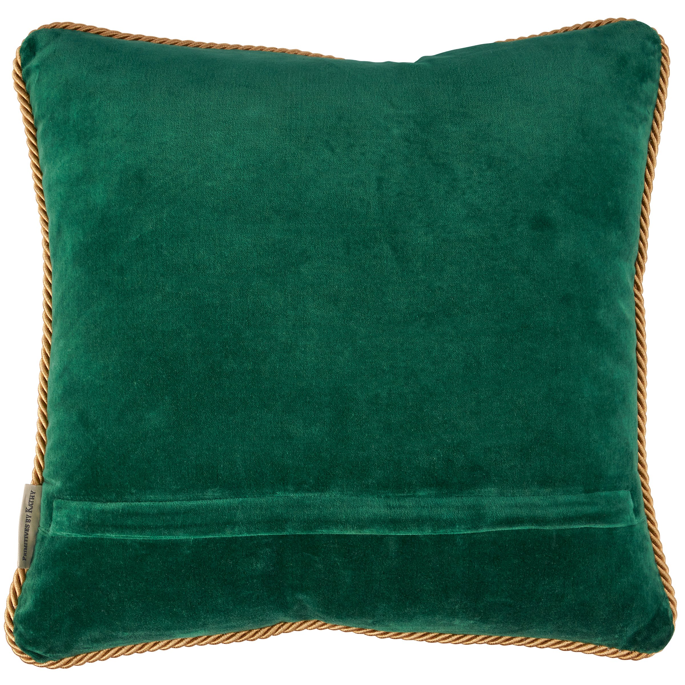 A decorative cotton pillow from our Moody Collection displaying a hand pained design of florals in a deep color palette replicated from original art hand painted in a unique watercolor style. Pillow features coordinating green velvet on back with rope trim and an embroidered square on the front using gold metallic tread. Our Moody Floral pillow includes a zipper to easily remove and clean machine-washable pillow cover. Contains polyester filling and is shipped vacuum-sealed for protection and storage. A stylish everyday home accent perfect for any room.