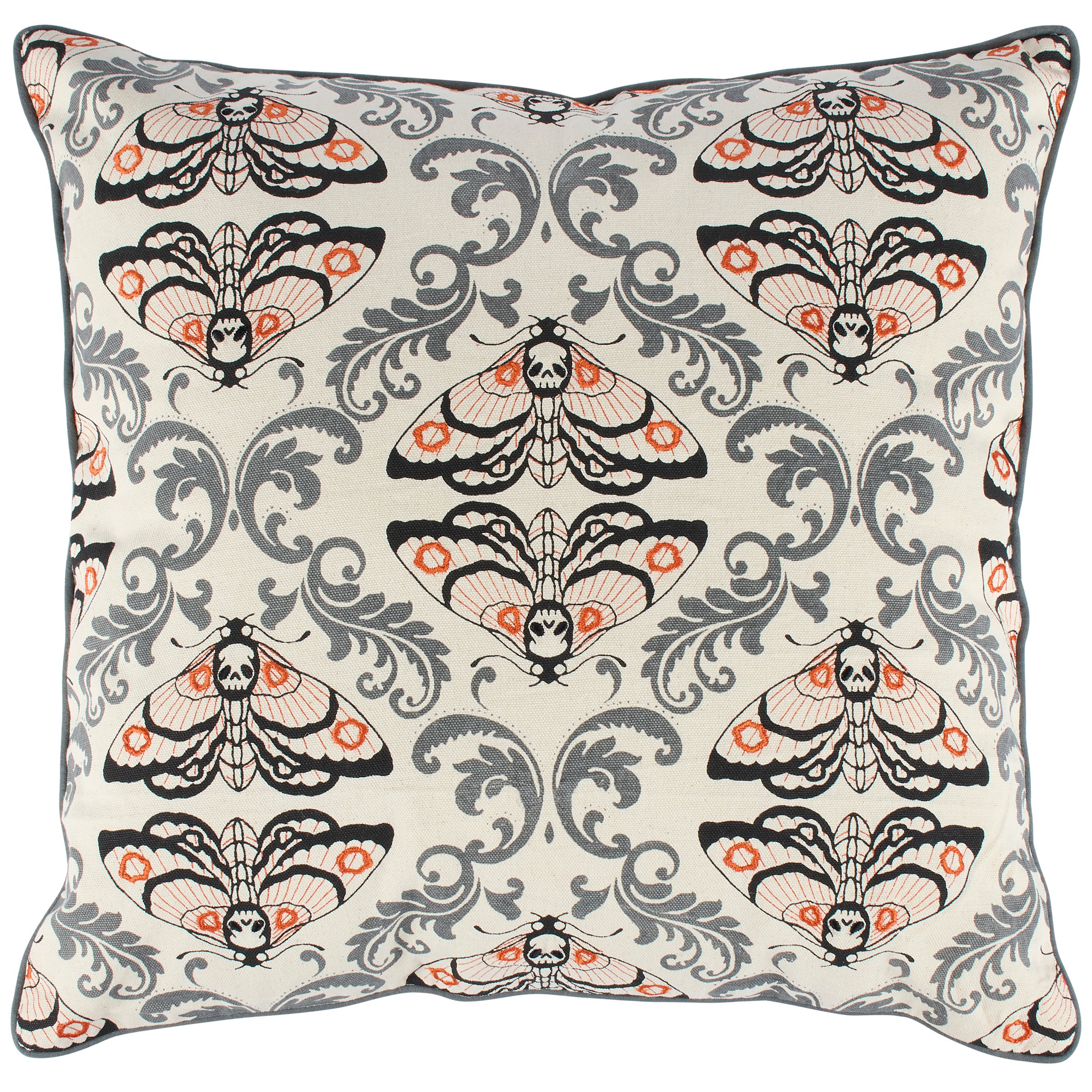 A decorative pillow from our Halloween Collection displaying an ornate pattern of moths with skulls in the design as well as embroidered accents for added texture. Moth pillow features a coordinating gray piping trim. Our Moth Skull pillow features a zipper to easily remove and clean the machine-washable pillow cover. Halloween pillow contains polyester filling and is shipped vacuum-sealed for protection and storage. A Halloween home accent perfect for adding seasonal style to any room.