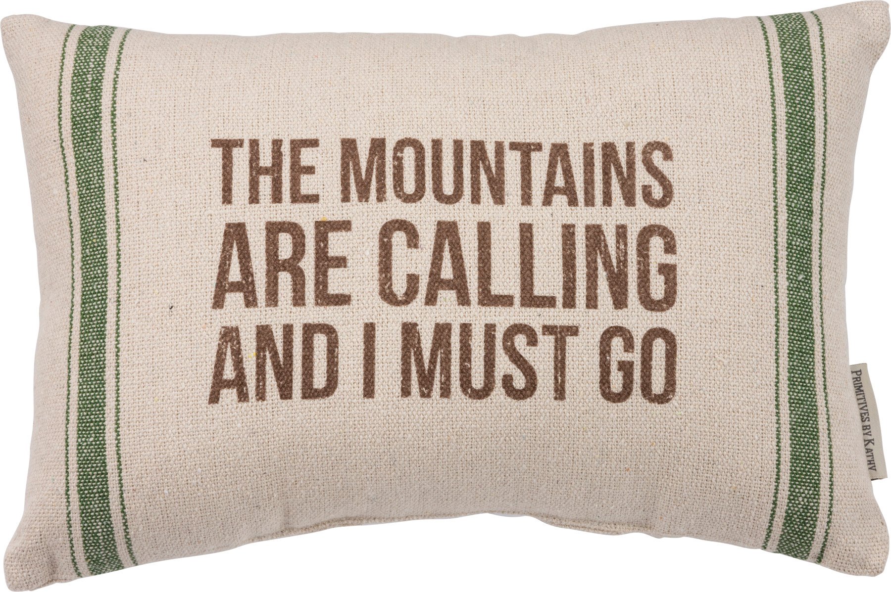 A cotton and polyester pillow from our Lake & Cabin Collection featuring a distressed "The Mountains Are Calling And I Must Go" sentiment with striped designs in a neutral palette. Complements well with existing decor for a cozy lake house or cabin accent. Includes a zipper to easily remove and clean cover. The Mountains Are Calling And I Must Go pillow is shipped vacuum sealed for protection or storage.