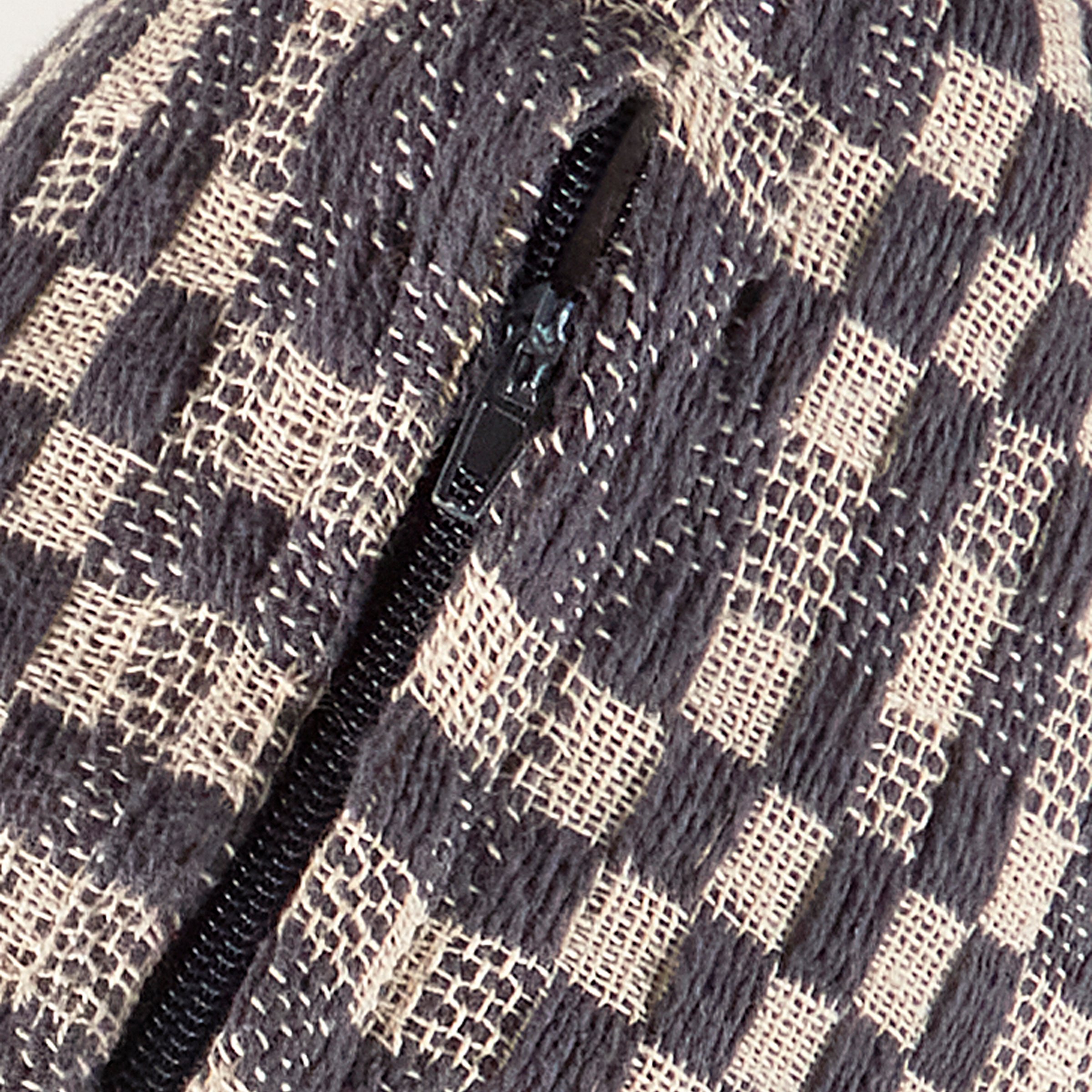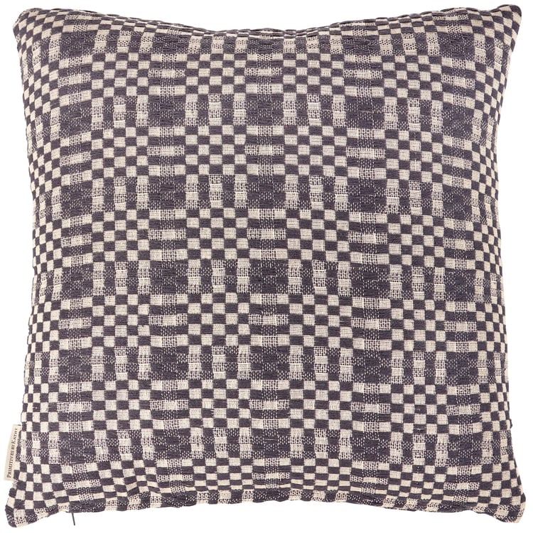 A decorative cotton throw pillow from our Primitive Collection displaying a double-sided design of checkered patterns in navy and cream. Our Navy Checkered pillow includes a zipper to easily remove and clean machine-washable pillow cover. Pillow contains polyester filling and is shipped vacuum-sealed for protection and storage. A rustic everyday home accent that adds style to any room.