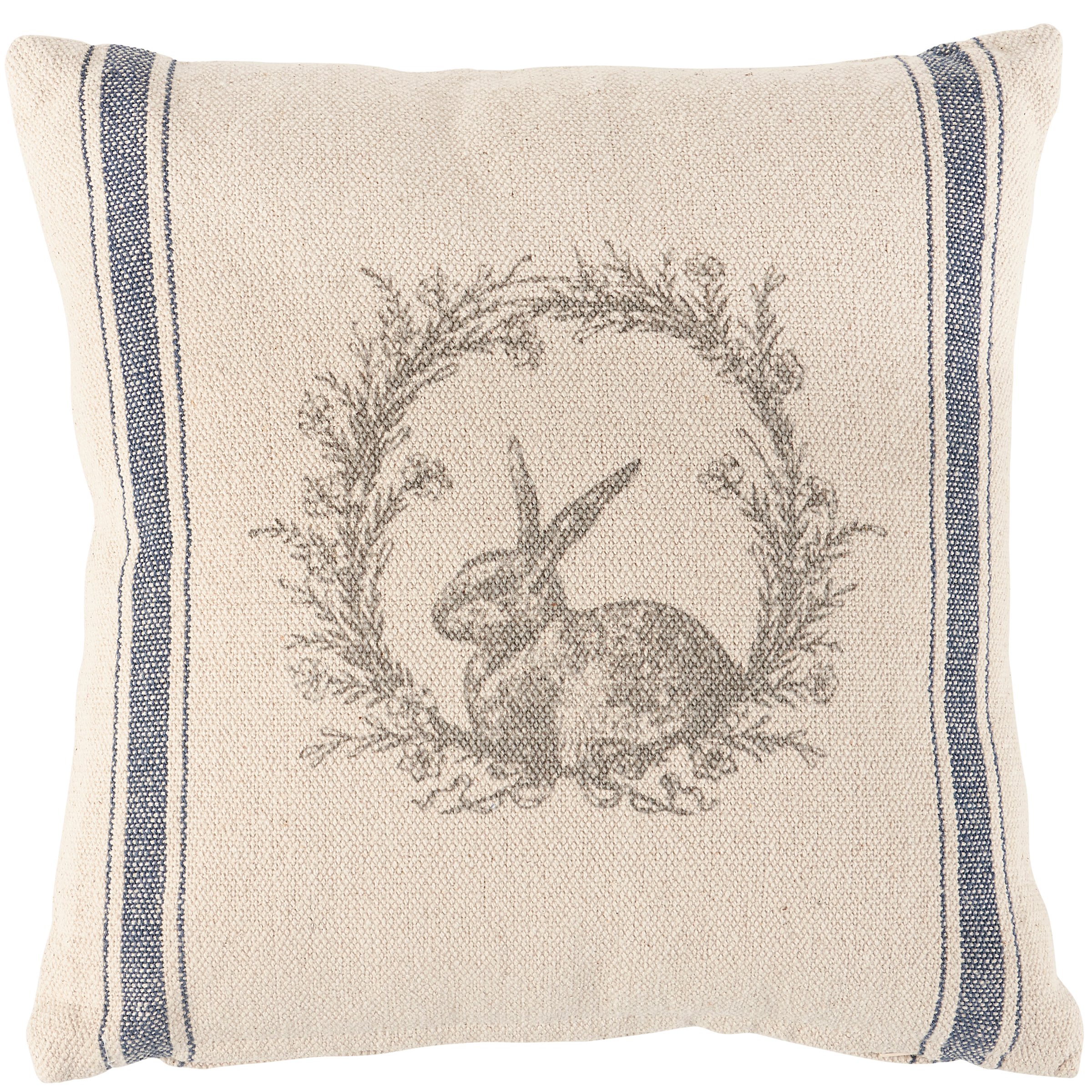 A decorative cotton pillow from our Easter & Spring Collection displaying a vintage style design of a rabbit laying in a floral wreath with blue stripes woven along each side. Pillow features woven blue stripes on back. Our Wreath Rabbit pillow includes a zipper to easily remove and clean machine-washable pillow cover. Pillow contains polyester filling and is shipped vacuum-sealed for protection and storage. The Wreath Rabbit pillow is a vintage seasonal home accent that coordinates with a variety of décor.