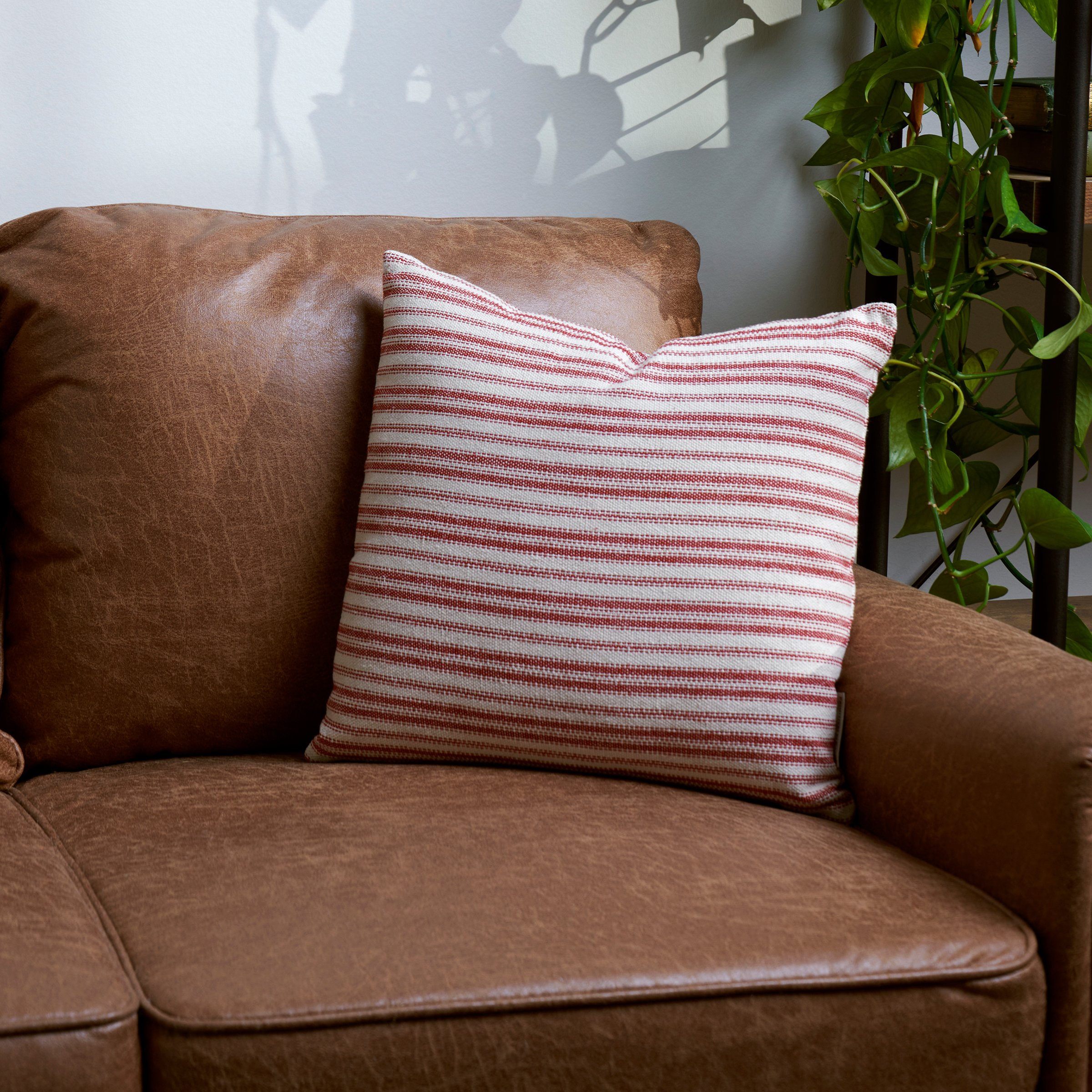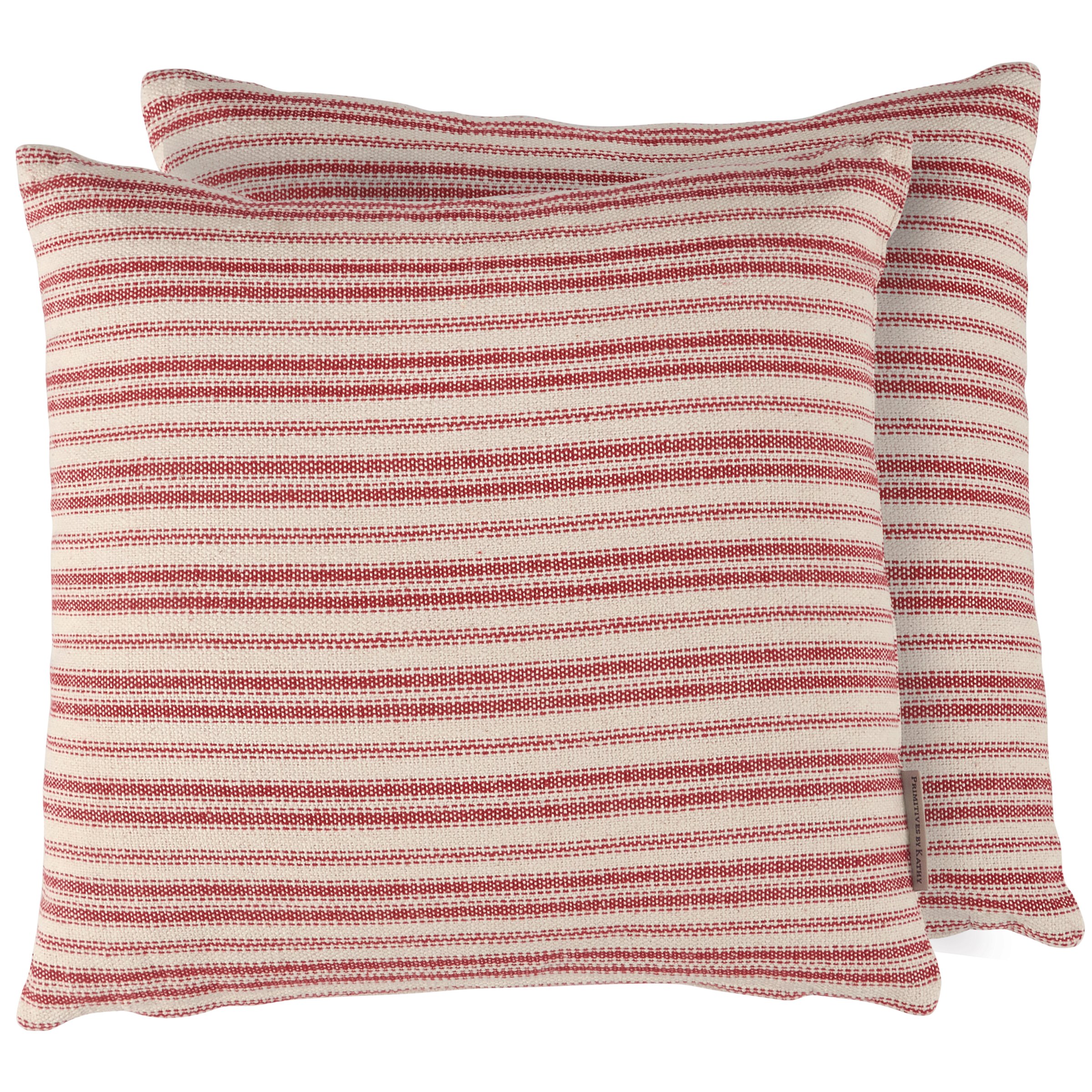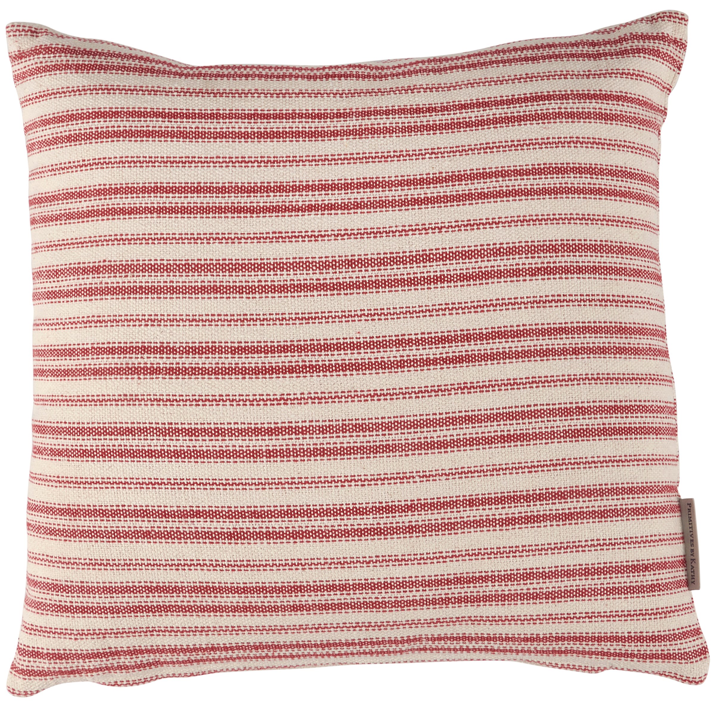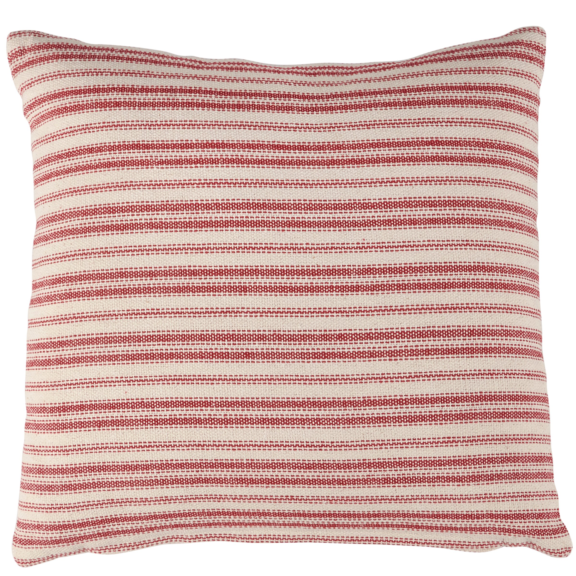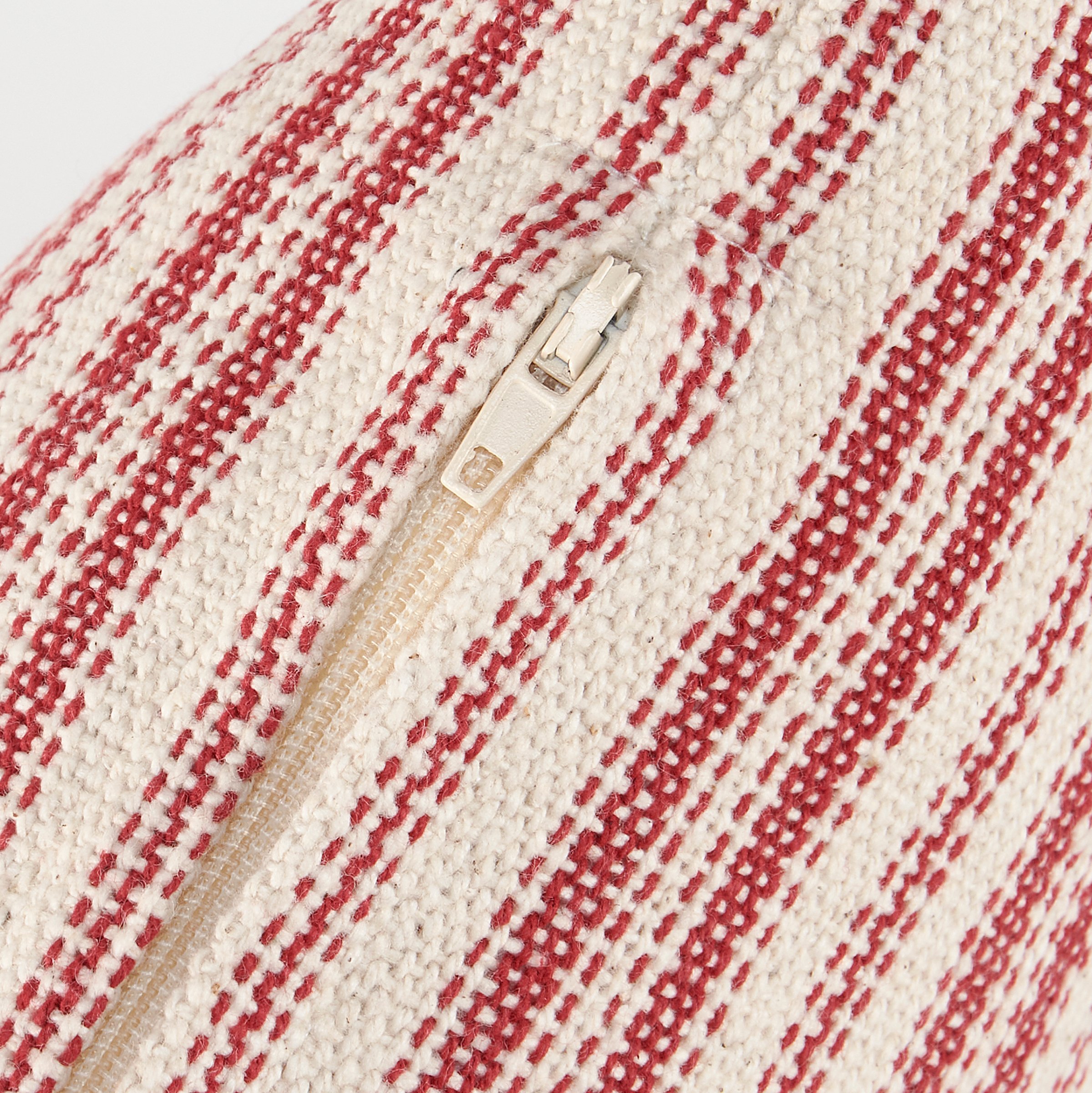 A decorative cotton throw pillow from our Christmas Collection displaying candy cane inspired red and white stripes woven throughout. Our Red Stripe pillow includes a zipper to easily remove and clean machine-washable pillow cover. Seasonal pillow contains polyester filling and is shipped vacuum-sealed for protection and storage. A rustic seasonal home accent perfect for adding style to any room.