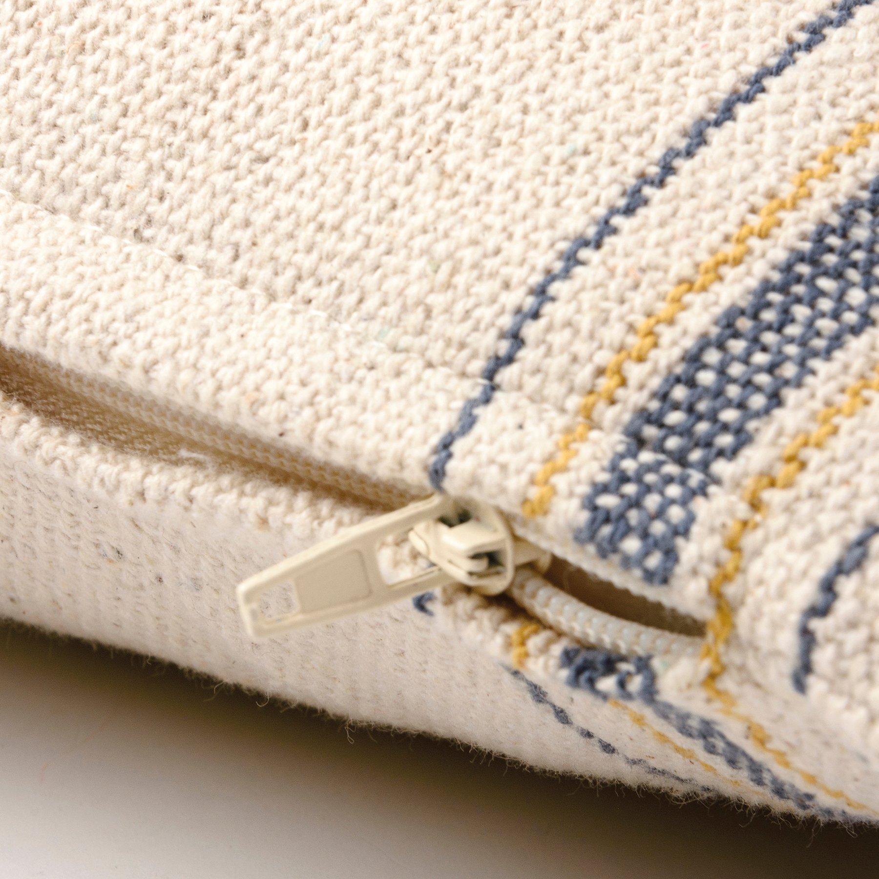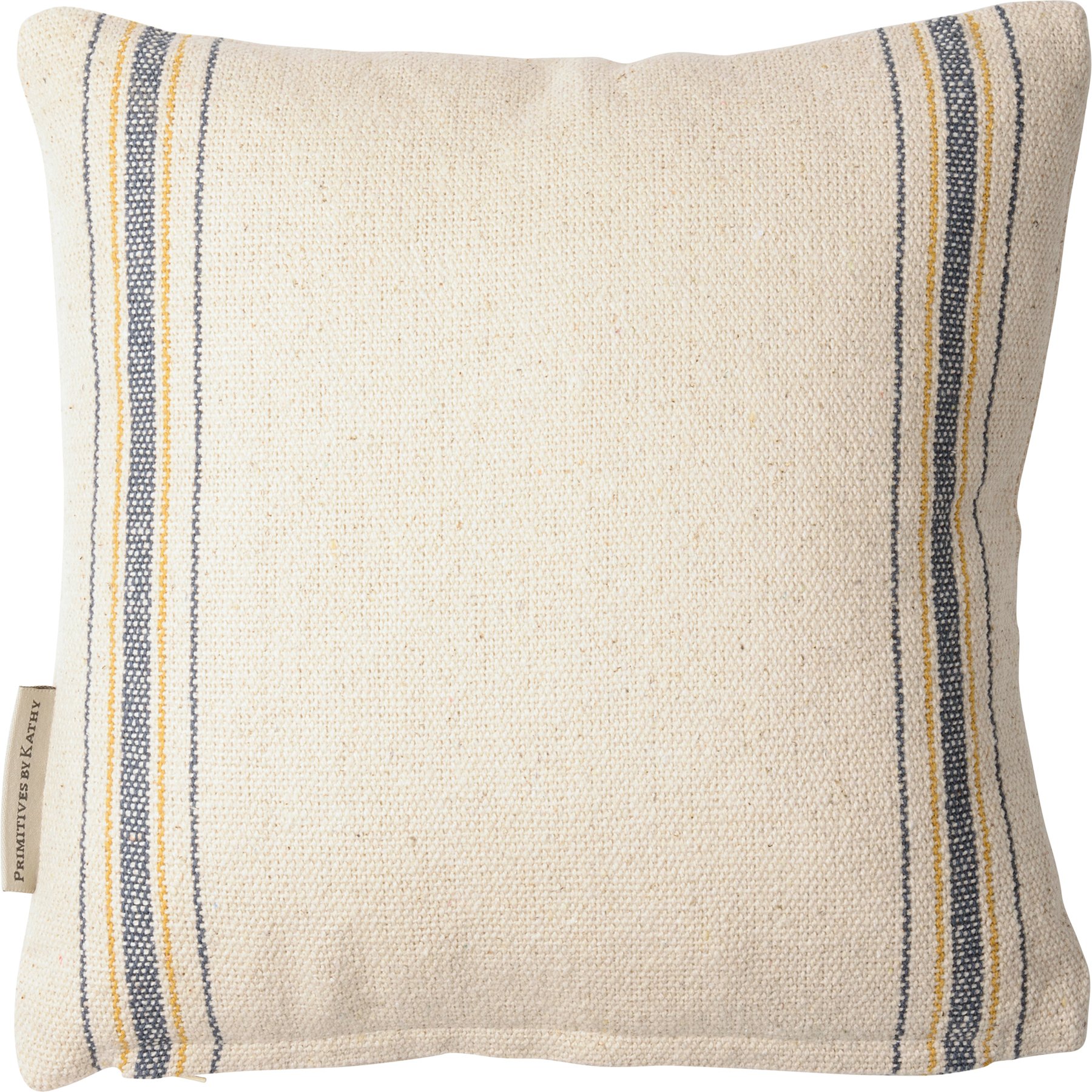 A decorative cotton throw pillow displaying woven rustic blue and gold stripes with a distressed dog inspired sentiment that reads "Reserved For The Dog - Sit At Your Own Risk." Our Reserved For The Dog pillow includes a zipper to easily remove and clean machine-washable pillow cover. Rustic pillow contains polyester filling and is shipped vacuum-sealed for protection and storage. A rustic pet-themed home accent perfect for adding style to any room.