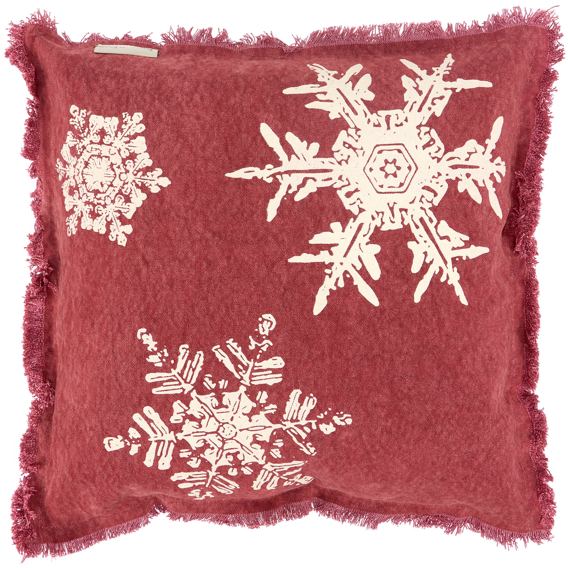 A canvas cotton pillow from our Christmas Collection displaying a holiday red color with vintage snowflake designs on the front and back and a frayed trim that coordinates well with rustic home decor. Our Rustic Snowflake pillow includes a zipper to easily remove and clean machine-washable pillow cover. Seasonal pillow contains polyester filling and is shipped vacuum-sealed for protection and storage. A Christmas home accent perfect for adding rustic seasonal style to any room.