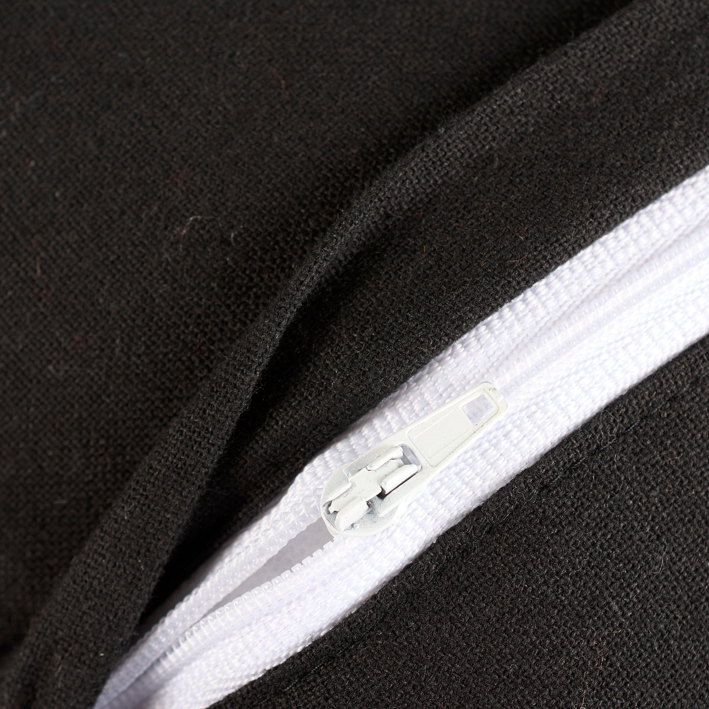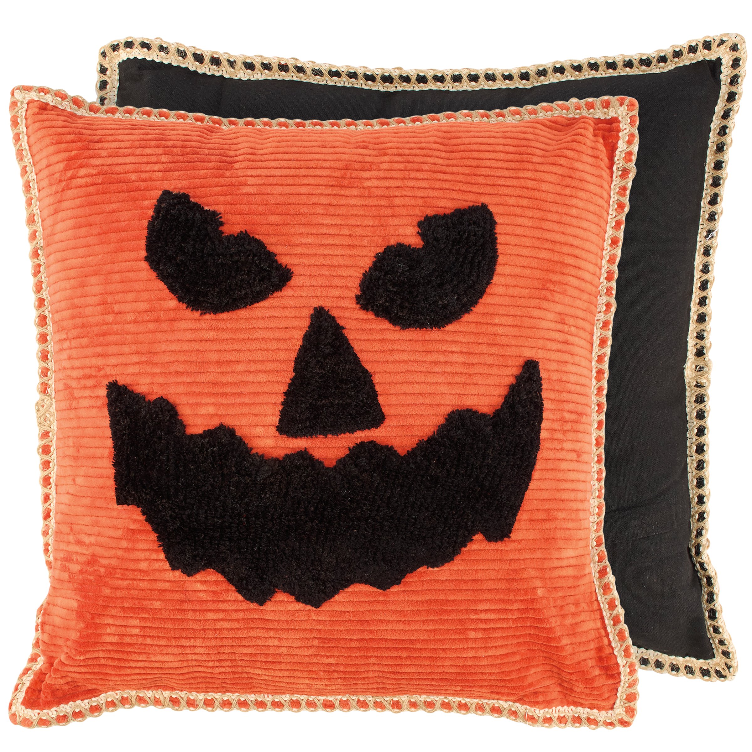 An orange corduroy pillow from our Halloween Collection displaying a scary jack o'lantern face design made with a raised black cotton texture. Halloween pillow also features black cotton on the back and jute box stitch on the trim. Our Scary Pumpkin Face pillow features a zipper to easily remove and clean machine-washable pillow cover. Seasonal pillow contains polyester filling and is shipped vacuum-sealed for protection and storage. A fun Halloween home accent perfect for adding seasonal style to any room.