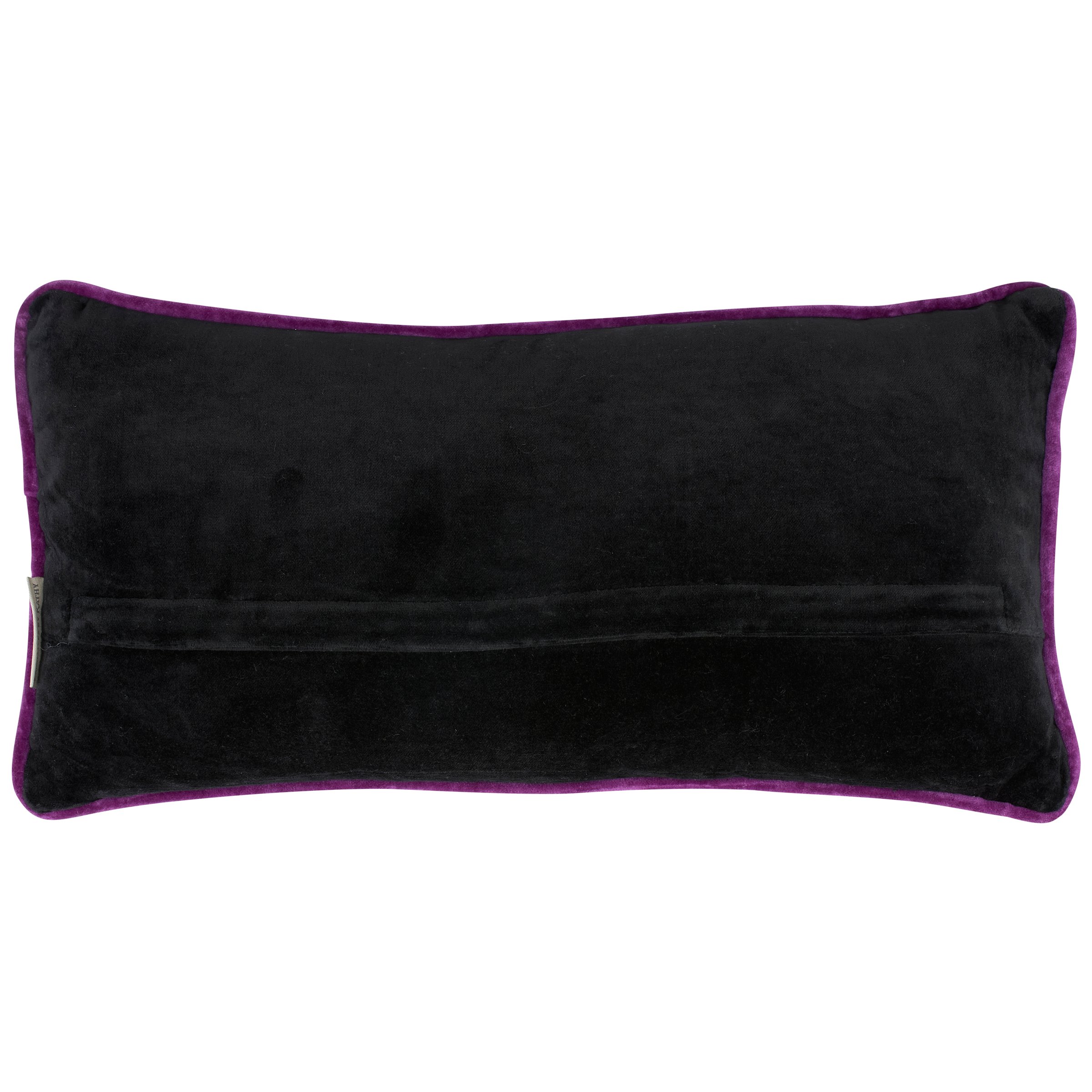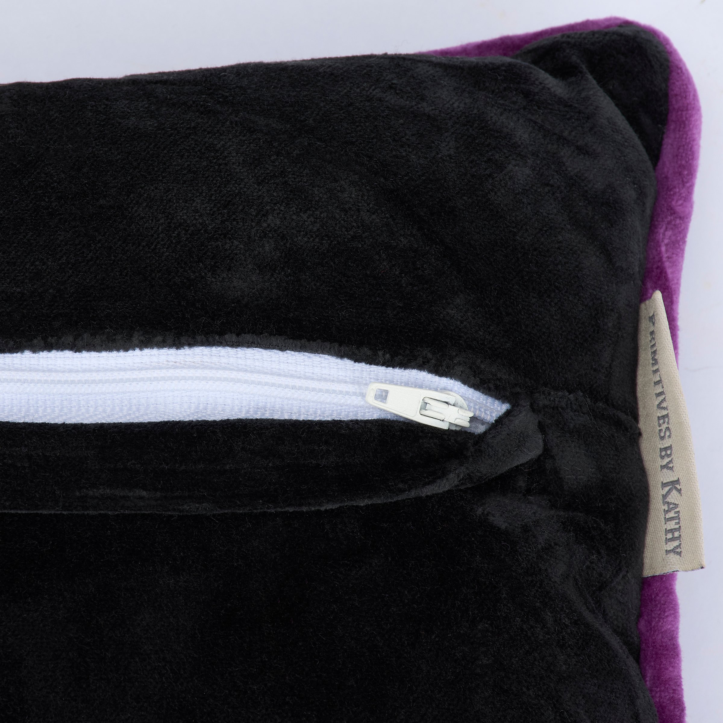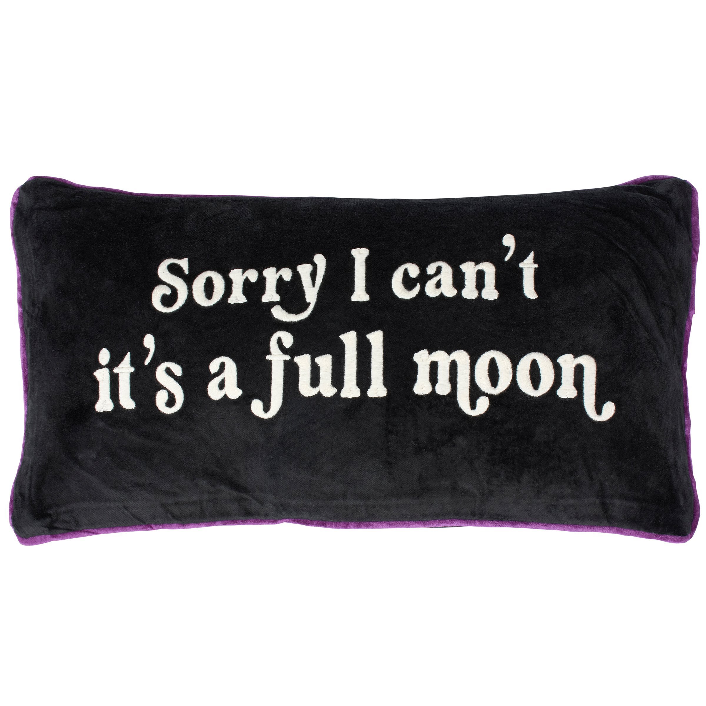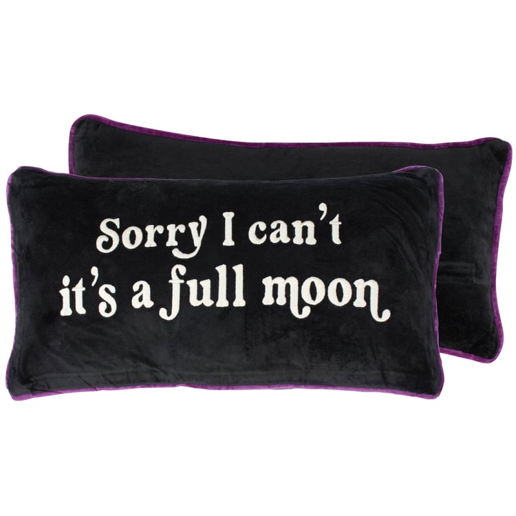 A decorative pillow from our Halloween Collection featuring a fun witch inspired sentiment embroidered on black velvet that reads "Sorry I Can't - It's A Full Moon." Witch themed pillow also features black velvet on the back and a purple piping trim. Our Sorry It's A Full Moon pillow features a zipper to easily remove and clean machine-washable pillow cover. Velvet pillow contains polyester filling and is shipped vacuum-sealed for protection and storage. A fun witch themed home accent perfect for adding personal style to any room.