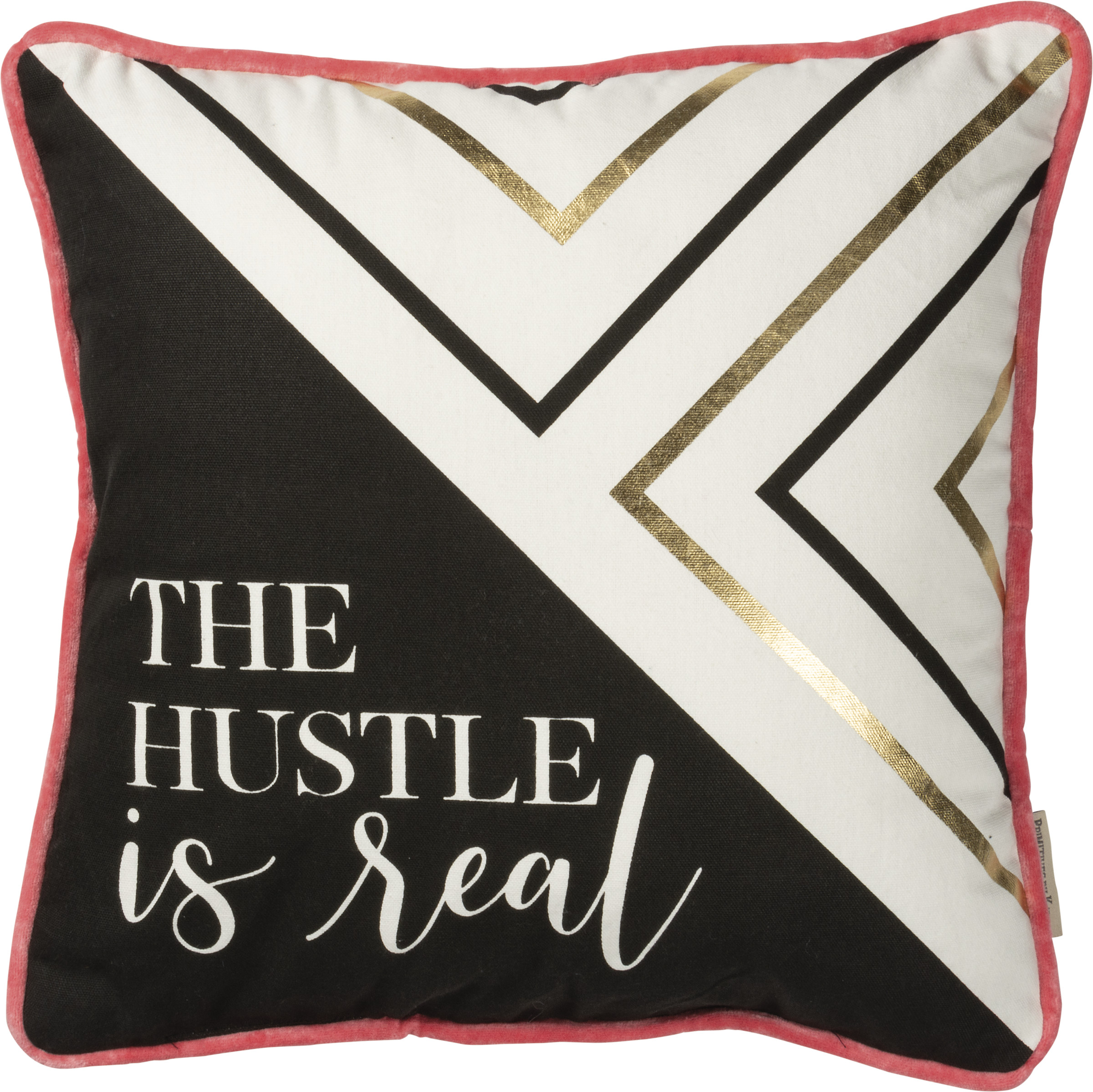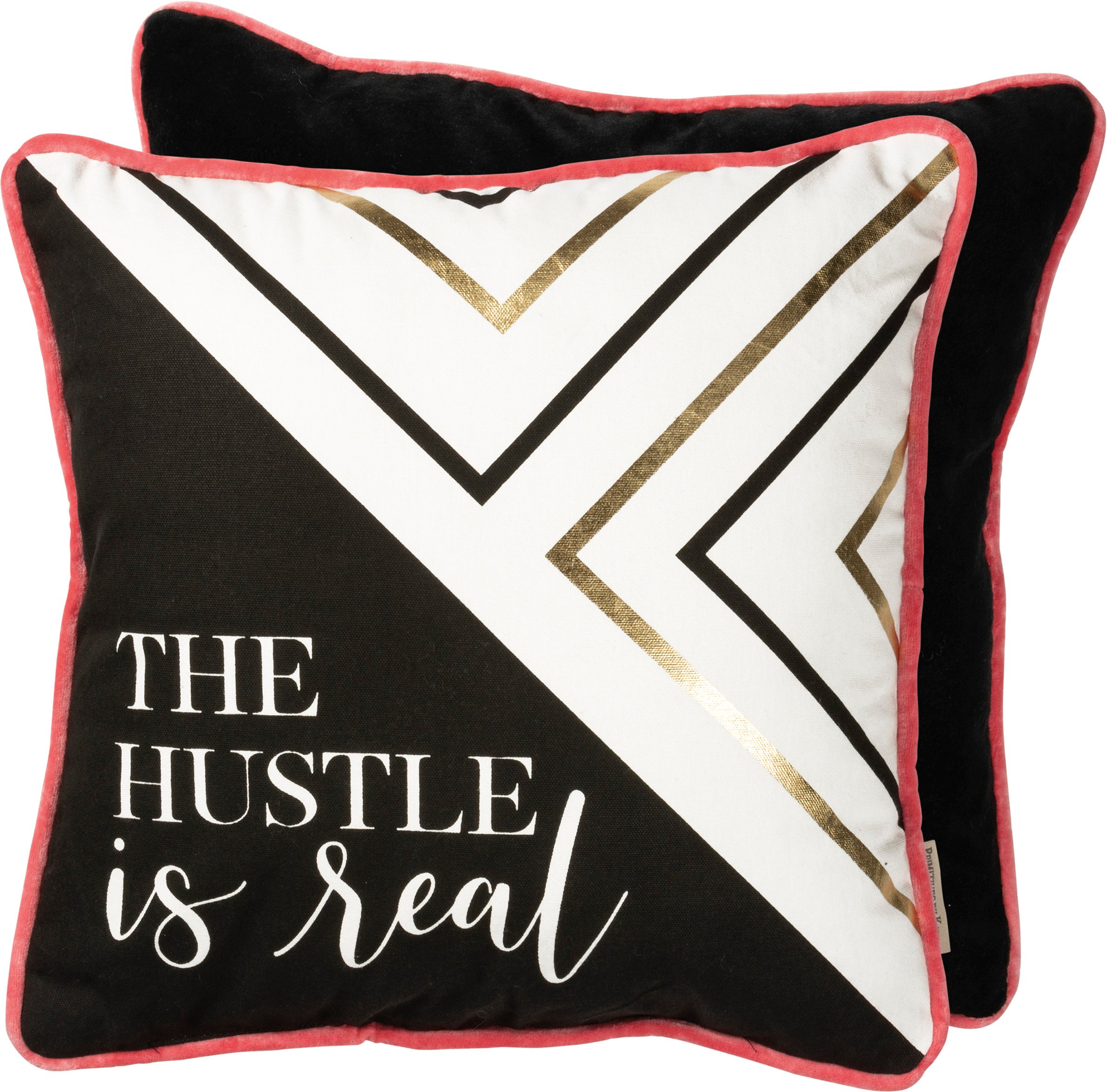 A square cotton front pillow with velvet back and piping in complementing colors. Features "The Hustle Is Real" sentiment with geometric pattern and gold foil accents. Polyester filling. Shipped vacuum-sealed for protection and storage. Complements well with other pieces in collection to create a cohesive display.