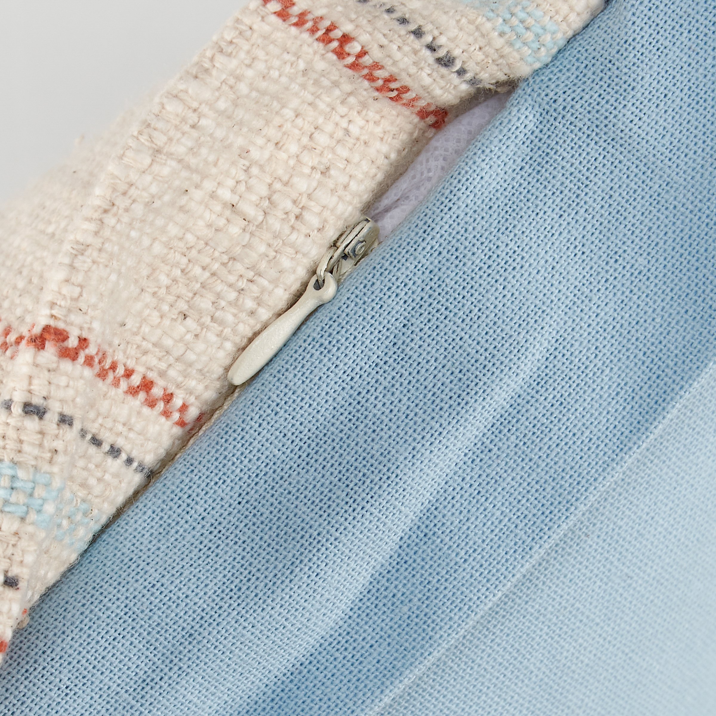 A decorative cotton throw pillow from our Farmhouse Collection displaying coordinating colored stripes woven throughout. Pillow features coordinating blue color on the back. Our Ticking Stripe pillow includes a zipper to easily remove and clean machine-washable pillow cover. Contains polyester filling and is shipped vacuum-sealed for protection and storage. A rustic everyday home accent perfect for adding style to any room.