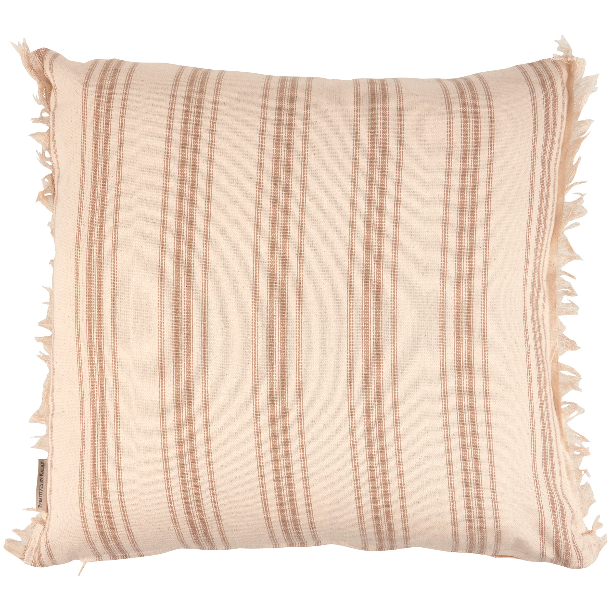 A cream cotton throw pillow from our Farmhouse Collection featuring a stitched art panel with frayed border and woven brown stripe designs throughout. Art panel displays a white highland cow in a field replicated from original artwork painted onto burlap canvas, giving the art a unique depth and texture. Our White Highland pillow also features frayed trim along sides with a zipper to easily remove and clean machine-washable pillow cover. Contains polyester filling and is shipped vacuum-sealed for protection and storage. A rustic everyday home accent perfect for adding style to any room.