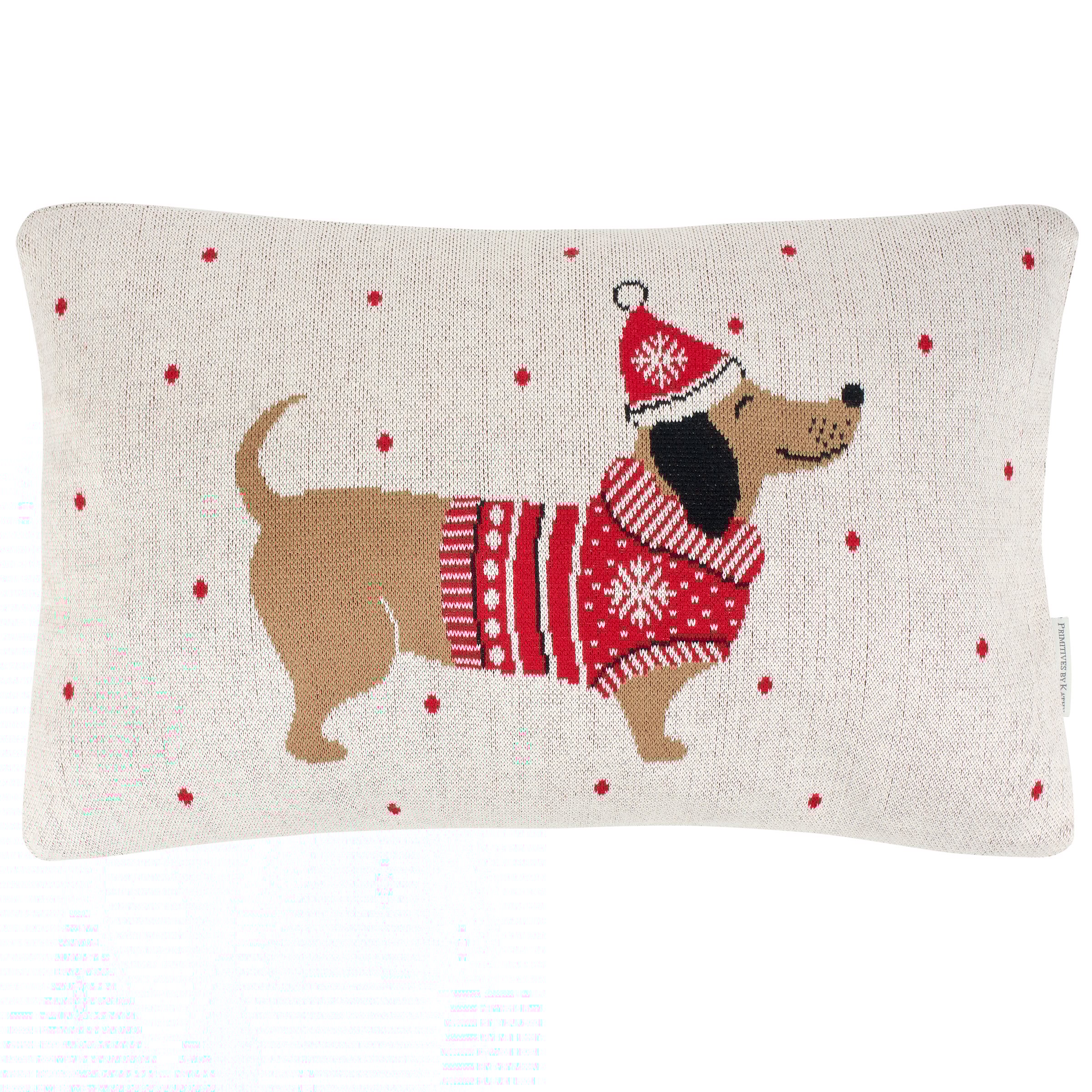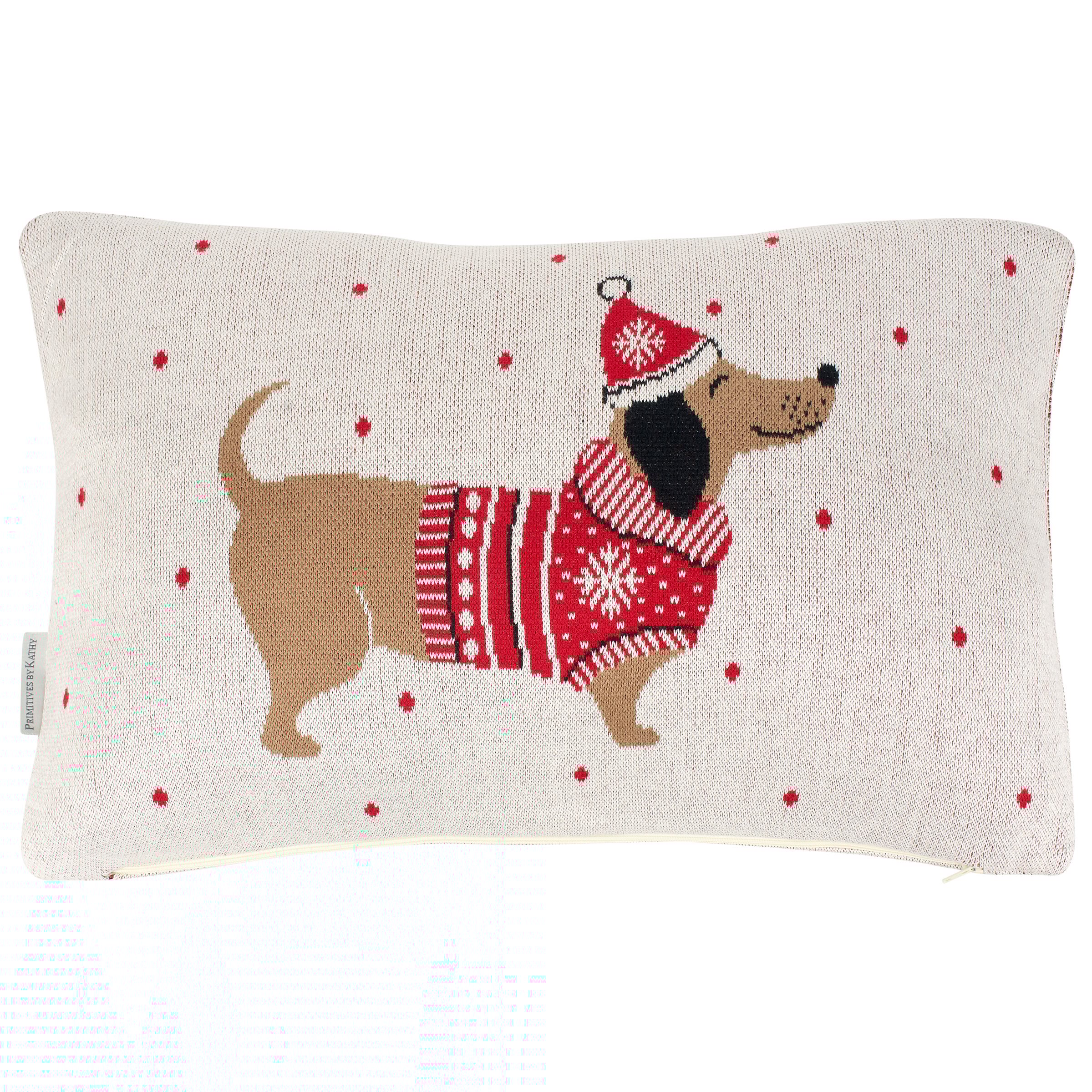 A decorative pillow from our Holiday Pet Collection/ featuring a double-sided woven design displaying cute dachshund wearing a winter sweater and hat. Our Winter Dachshund pillow features a zipper to easily remove and clean machine-washable pillow cover. Holiday pet pillow contains polyester filling and is shipped vacuum-sealed for protection and storage. A pet themed home accent perfect for adding seasonal style to any room.
