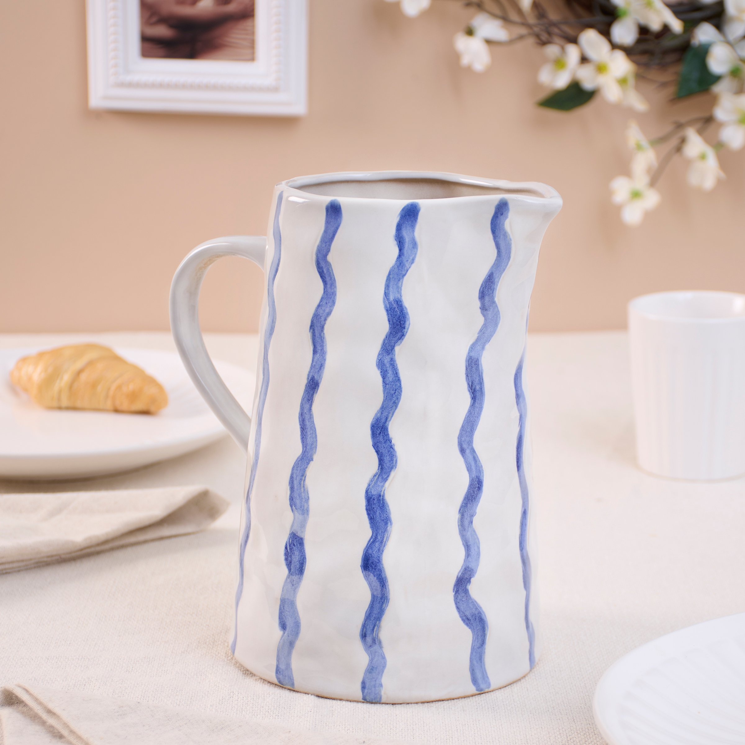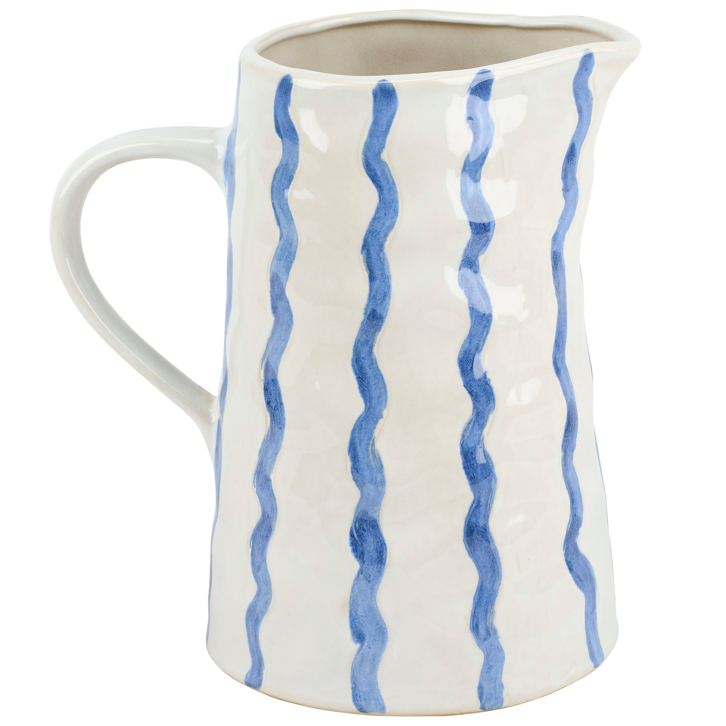 A durable stoneware pitcher from our Beach Collection displaying an ocean blue wavy strip pattern on white glaze finish. Our Blue Stripe pitcher is conveniently microwave, dishwasher, and food safe for easy use. A piece of stylish tableware perfect for beach themed tablescapes.