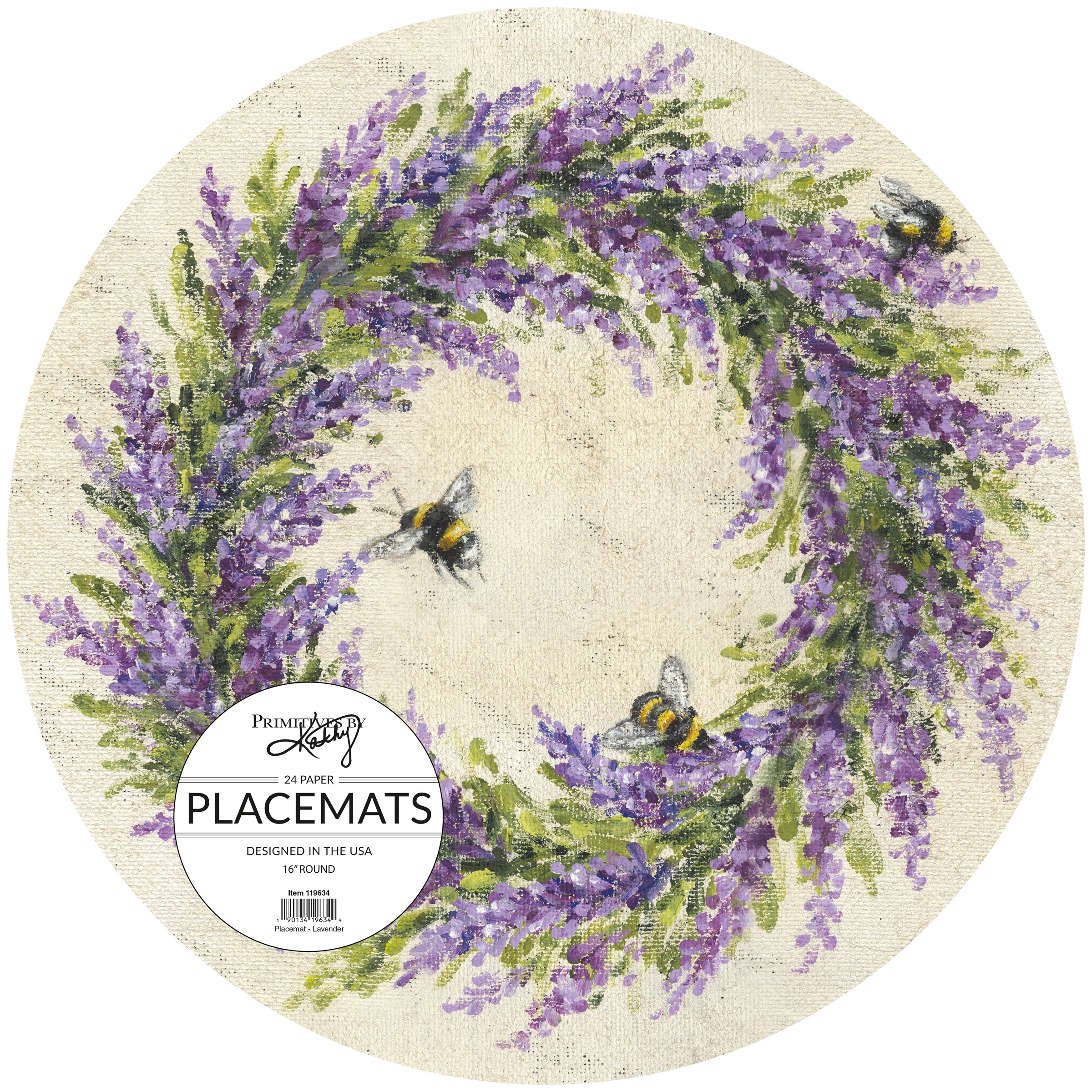 Great for customizing place settings and making clean-up a breeze, these round paper placemat pads from our Garden Collection display a lavender wreath design with bees. Design is replicated from original artwork painted onto burlap canvas, giving the art a unique depth and texture. Our Lavender placemat pads are shrink-wrapped for protection as well as easy storage and shelf display. Each pack includes 24 single-use, tear-off placemats. A garden-themed tabletop accessory perfect for customizing everyday place settings.