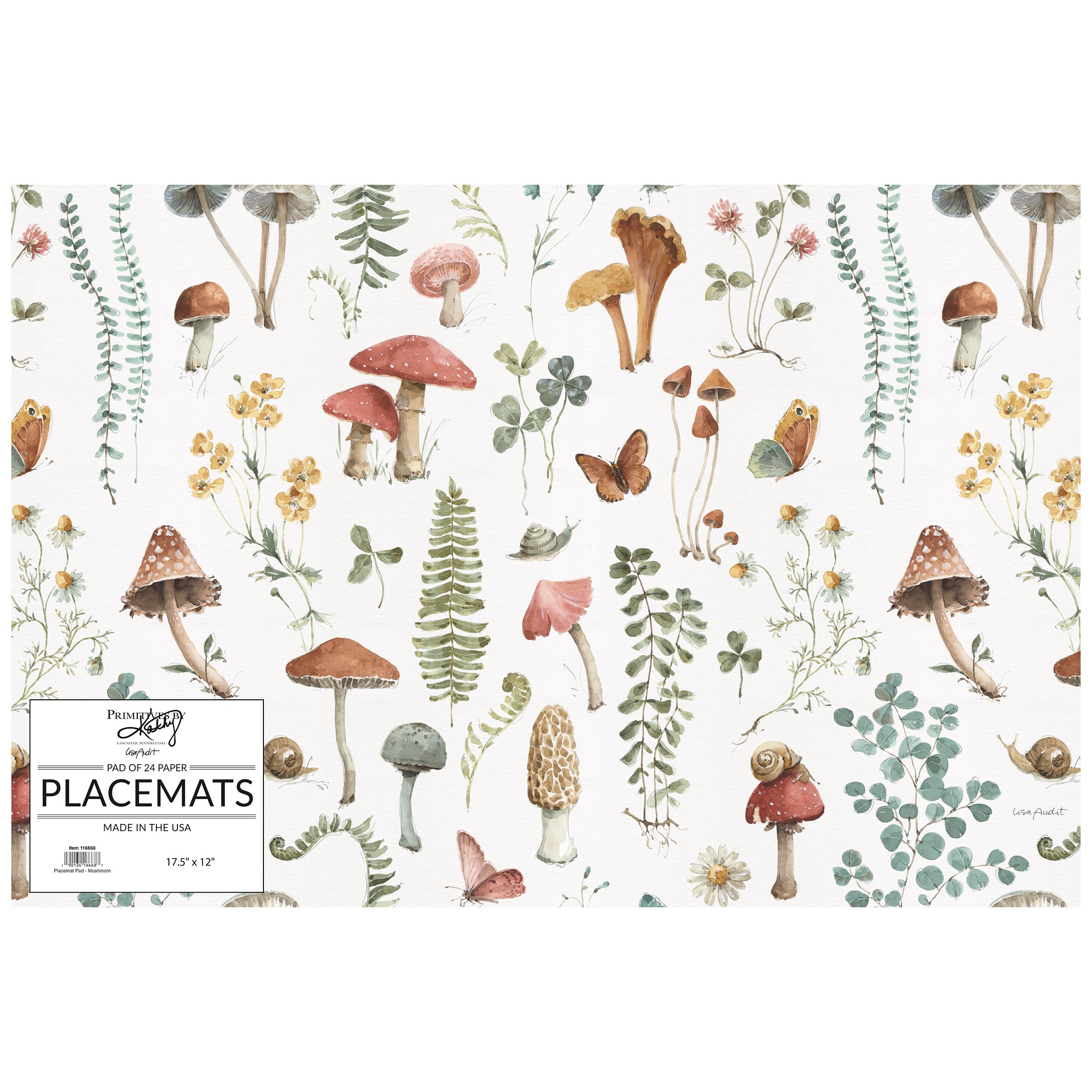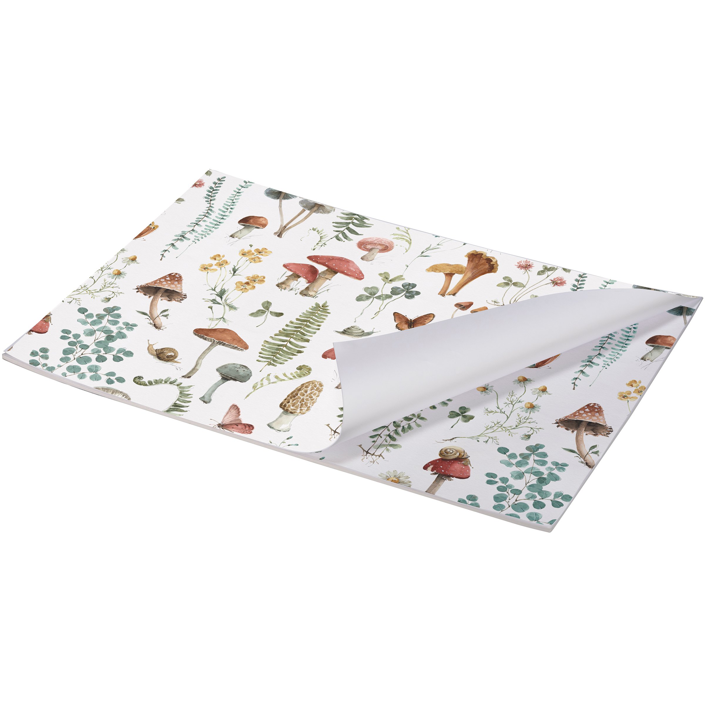 Great for making table clean-up a breeze, these paper placemat pads from our Cottagecore Collection display an all-over design of hand painted mushrooms with snails, butterflies, and wildflowers. Our Mushroom Study placemat pads are shrink-wrapped for protection as well as easy storage and shelf display. Each pack includes 24 single-use, tear-off placemats. A rustic tabletop accessory perfect for customizing everyday place settings.