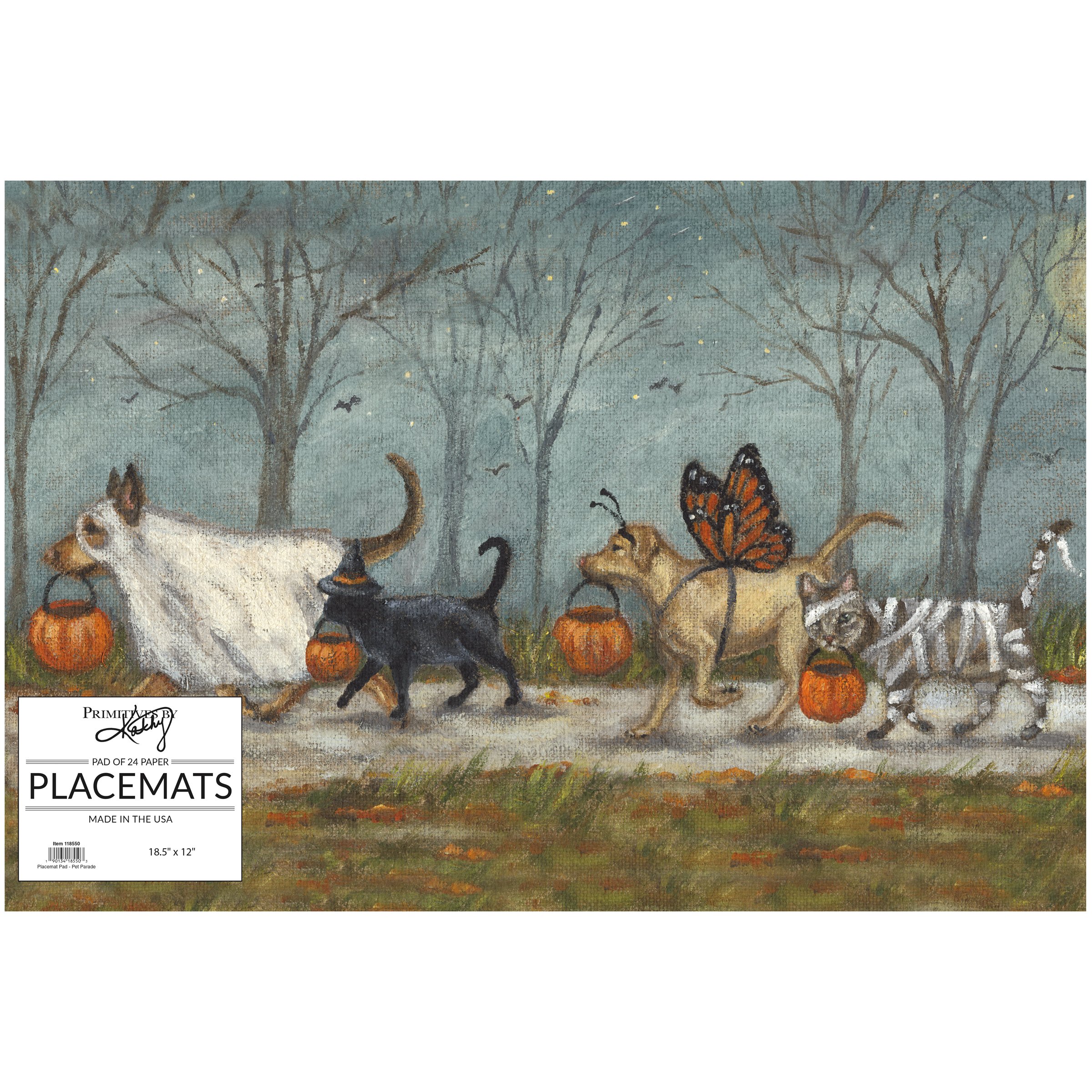 Great for customizing place settings and making clean-up a breeze, these paper placemat pads from our Halloween Collection display a hand painted design of pets in various Halloween costumes walking together holding treat buckets. Design is replicated from original artwork painted onto burlap canvas, giving the art a unique depth and texture. Our Spooky Pet Parade placemat pads are shrink-wrapped for protection as well as easy storage and shelf display. Each pack includes 24 single-use, tear-off placemats. A fun tabletop accessory perfect for customizing seasonal place settings.