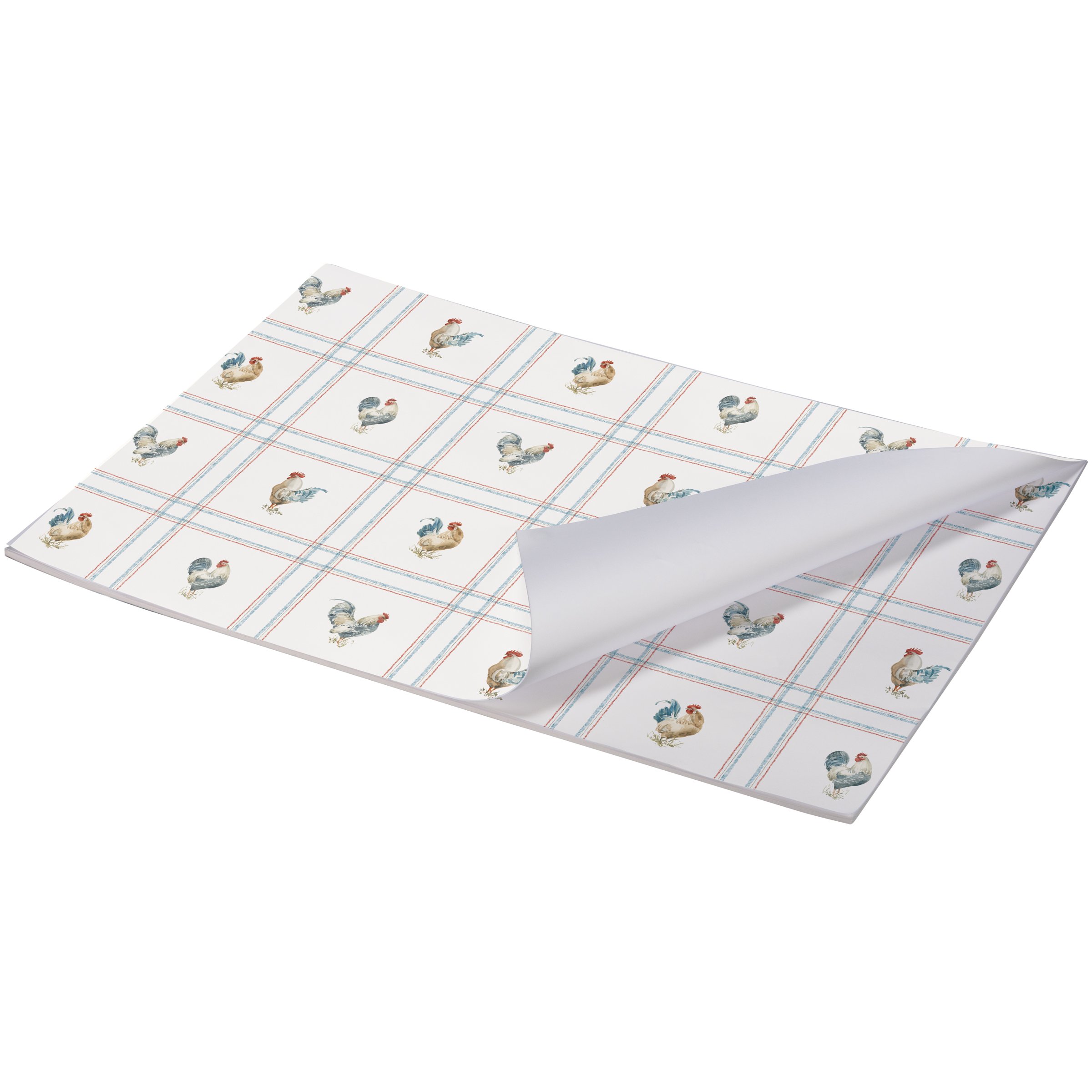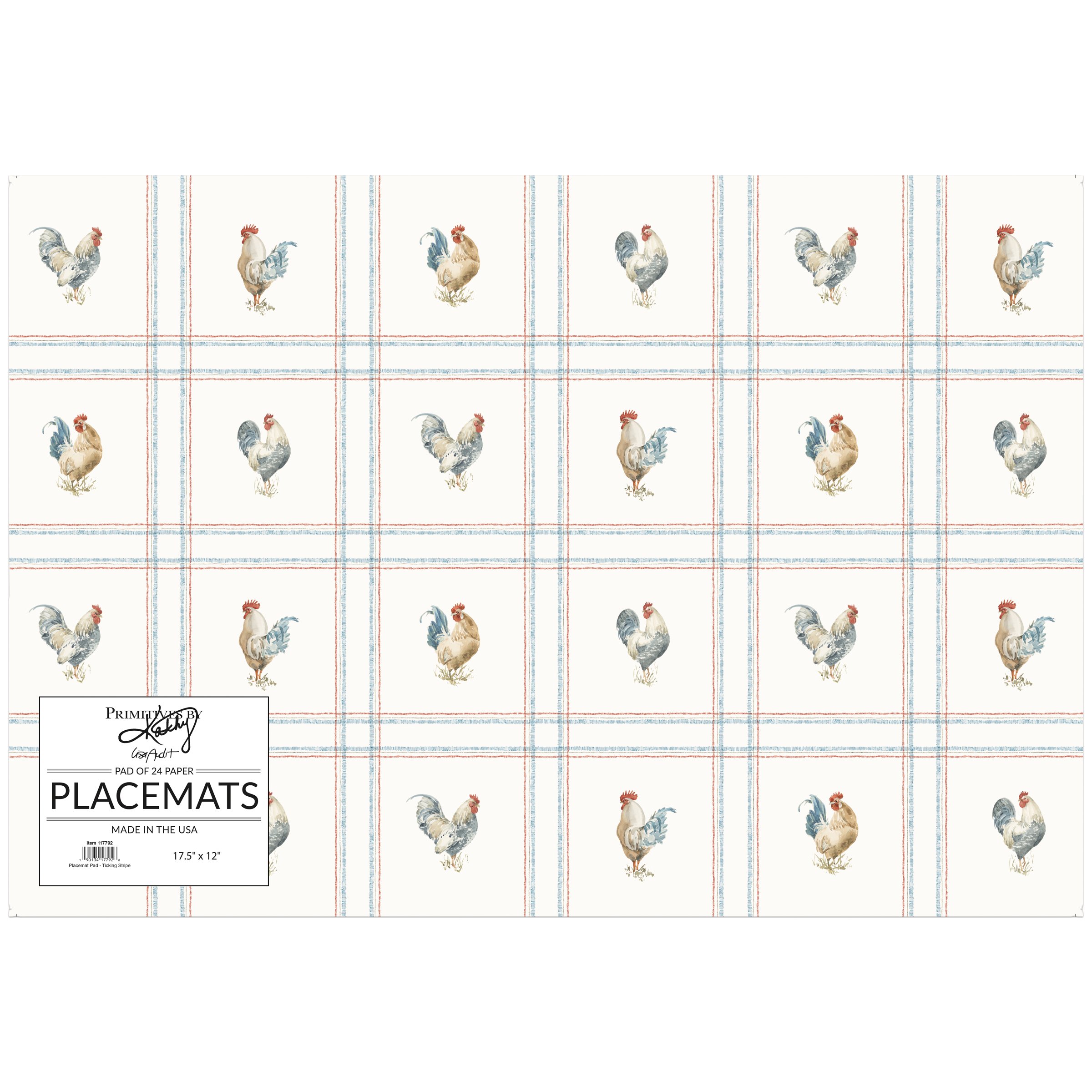 Great for making table clean-up a breeze, these paper placemat pads from our Farmhouse Collection display a pattern of chickens and complementing stripes in a rustic blue and red color palette. Design is replicated from original artwork hand painted in a delicate watercolor style. Our Ticking Stripe Chickens placemat pads are shrink-wrapped for protection as well as easy storage and shelf display. Each pack includes 24 single-use, tear-off placemats. A rustic tabletop accessory perfect for customizing everyday place settings.