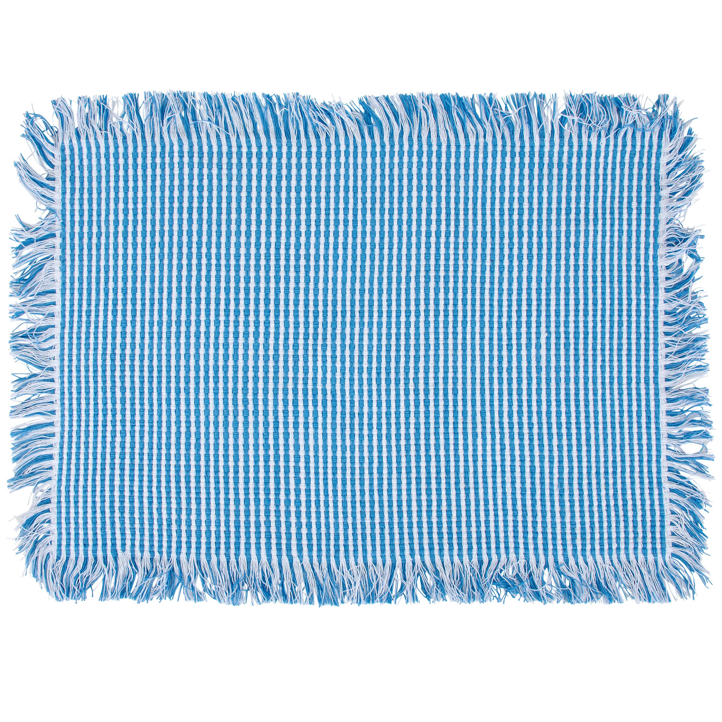 A set of 4 reusable cotton placemats from our Patriotic Collection featuring double-sided designs displaying American flag inspired blue stripes with fringe trims. Each patriotic placemat measures 19 inches by 13 inches for plenty of coverage when customizing place settings. Our Blue Stripe placemat set is conveniently machine-washable for easy cleaning. A set of rustic tabletop accessories perfect for 4th of July and Memorial Day decorating or celebrating stars and stripes all year round.