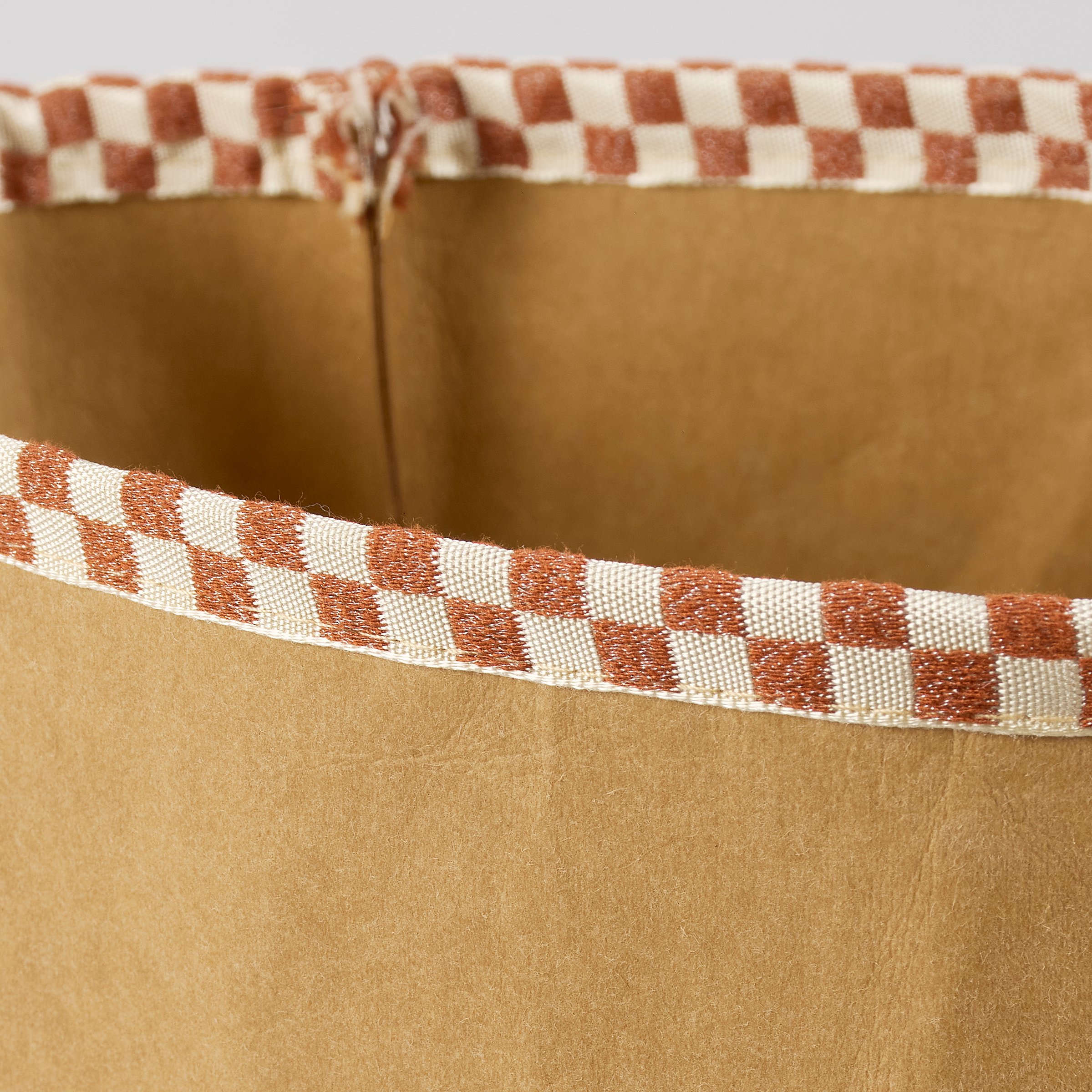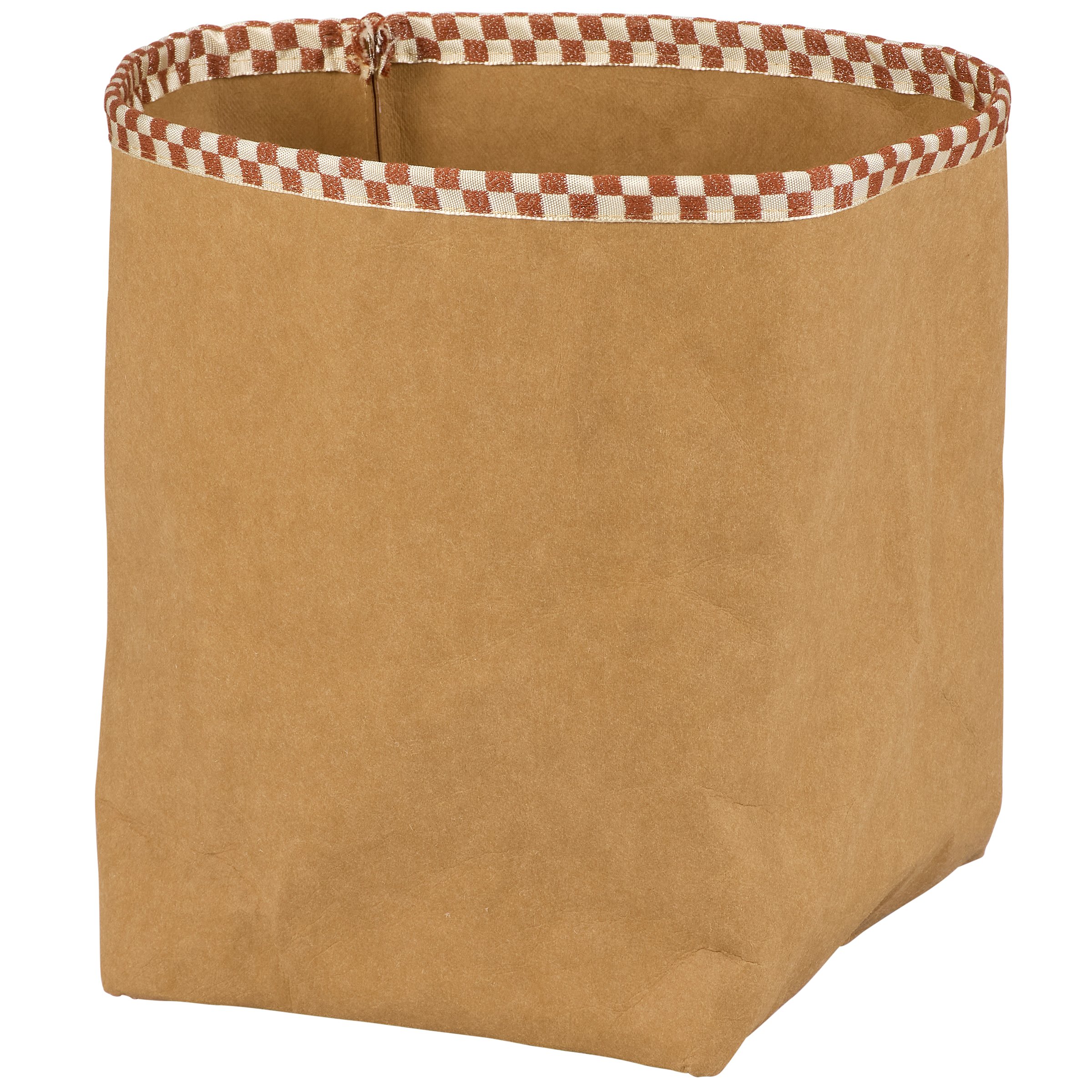 A sturdy paper plant cover from our Western Collection displaying a paper bag inspired design with coordinating check fabric trim. Our Paper Bag plant cover features opening on top to place plants or décor. Greenery pictured not included. A western inspired plant accessory with a variety of display options.