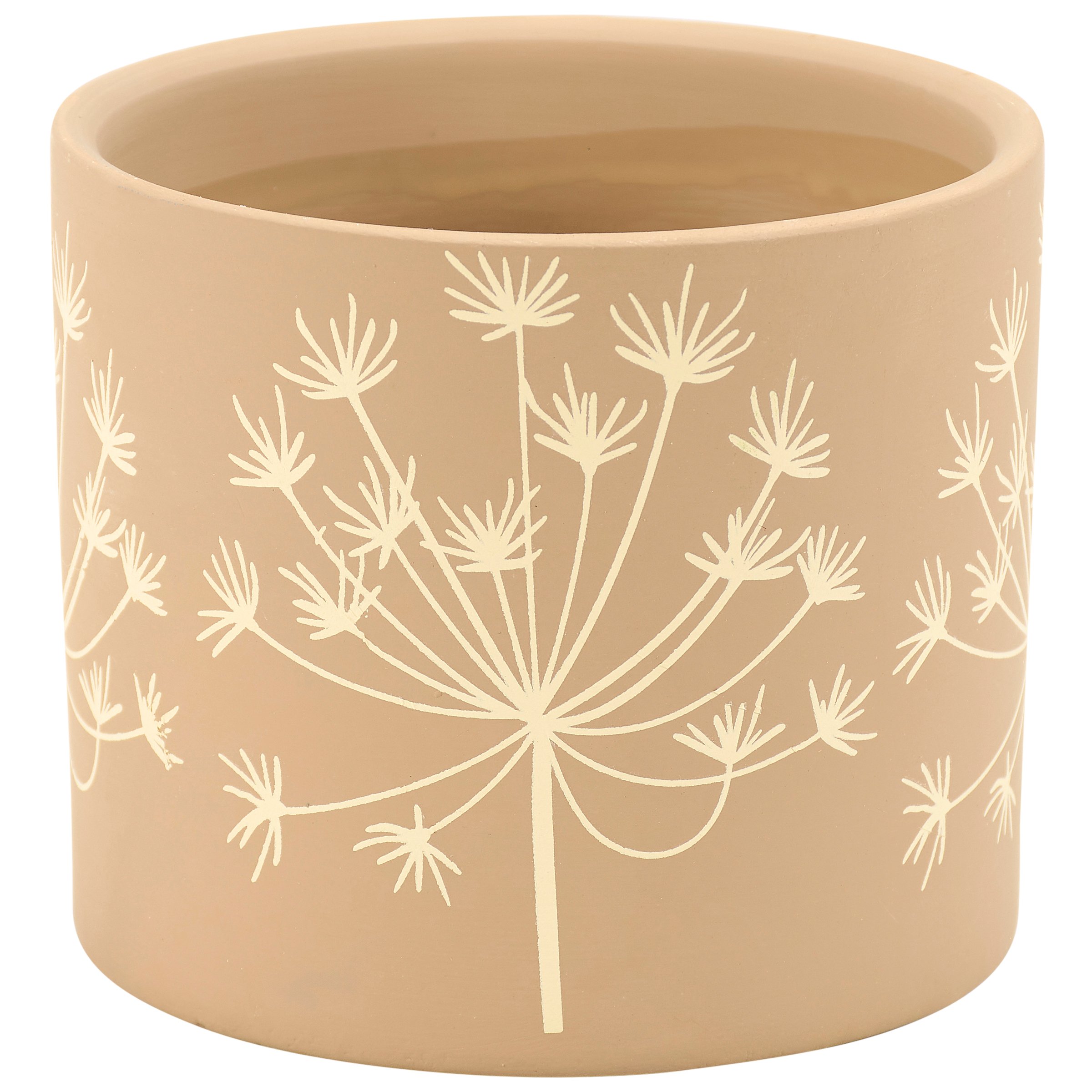 A ceramic planter from our Cottagecore Collection displaying debossed dandelion puff designs with colored painted accents. Our Dandelion Puff planter features an opening on top to place greenery or décor. Greenery pictured not included. A stylish plant accessory with a variety of display options.