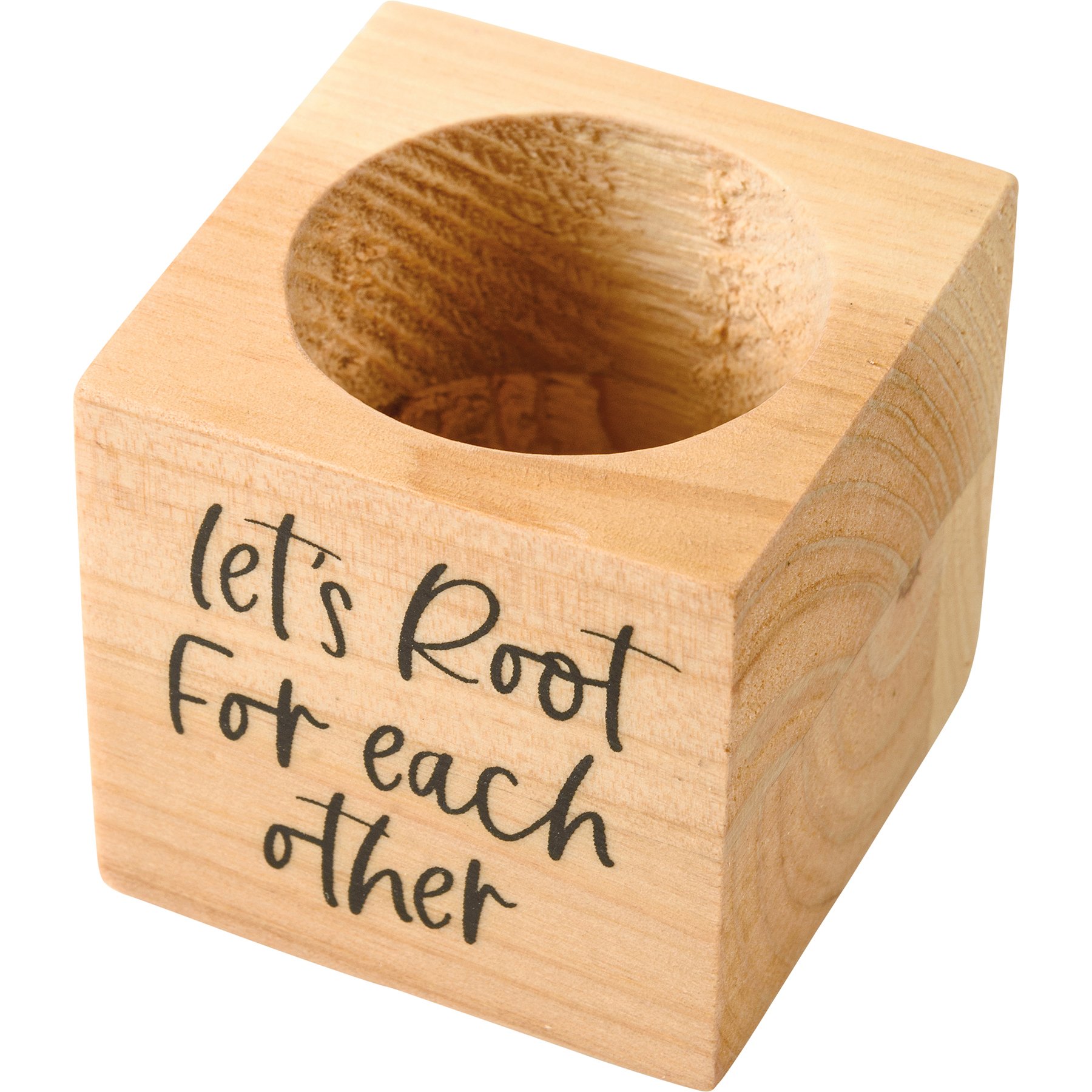 A set of three wooden planter magnets designed to hold small air plants. Magnets feature hand lettered "Let's Root For Each Other," "You Grow Girl," and "Ready, Set, Grow" sentiments. Planter magnets are packaged on a galvanized metal backer card with a cutout to easily hang on a rack. This house plant home decor is perfect for any space.