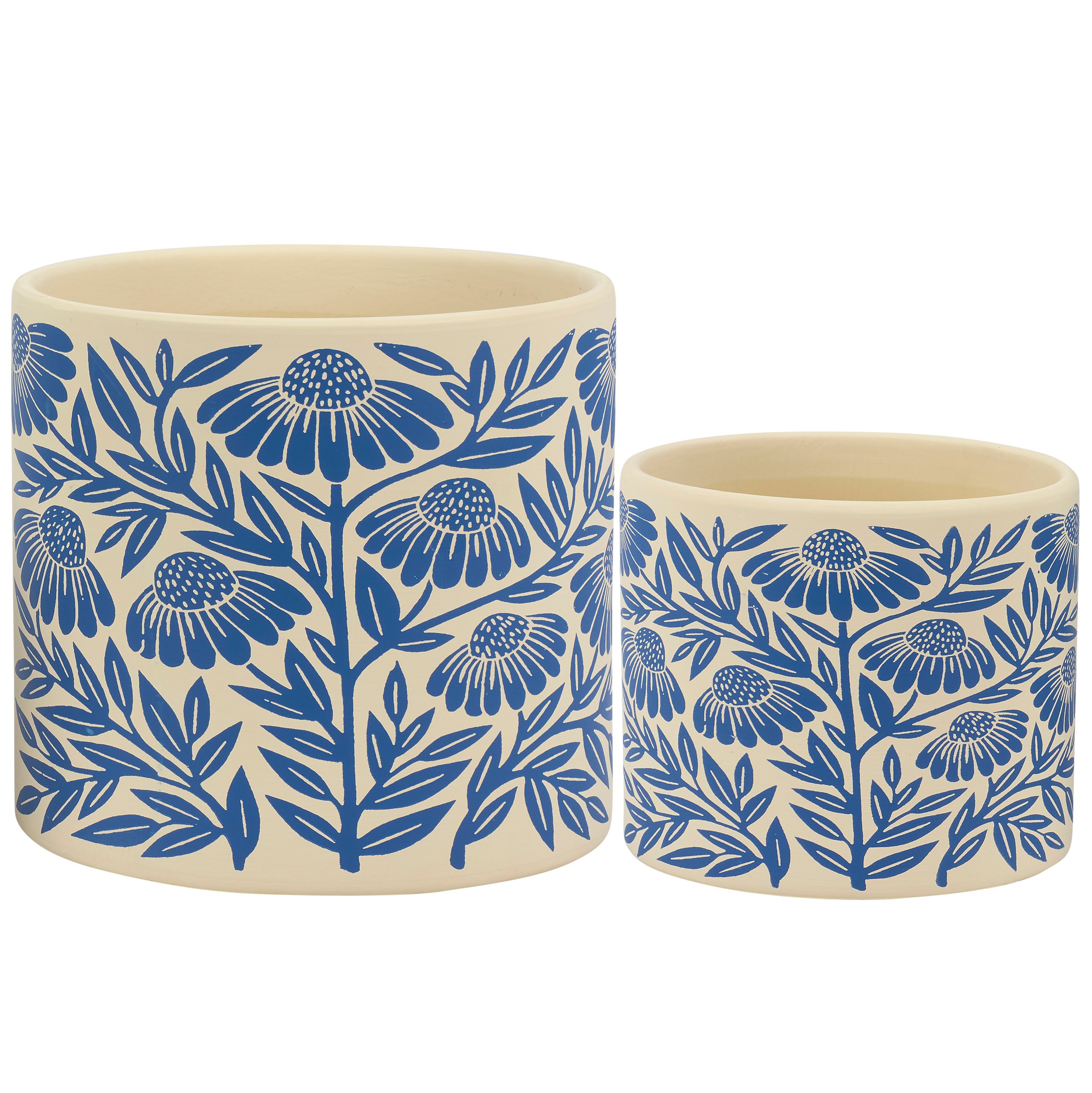 A set of terracotta planters from our Primitive Collection displaying folk art inspired patterns of blue florals around the outside each planter. Planter set includes 2 planters in different sizes that nest inside each other for compact storage. Our Blue Folk Art planter set features openings on top to place greenery or décor. Greenery pictured not included. A set of folk art themed plant accessories with a variety of display options.