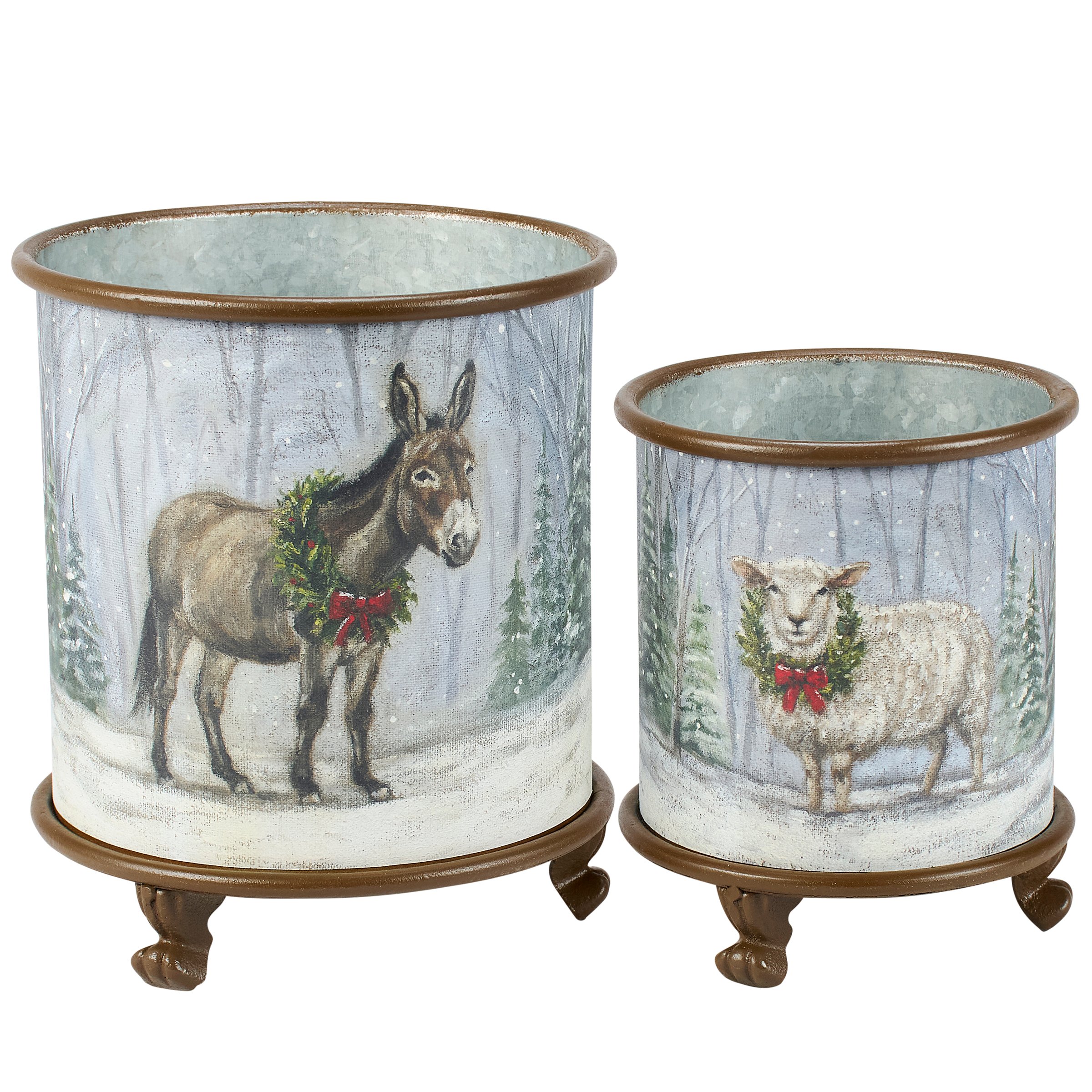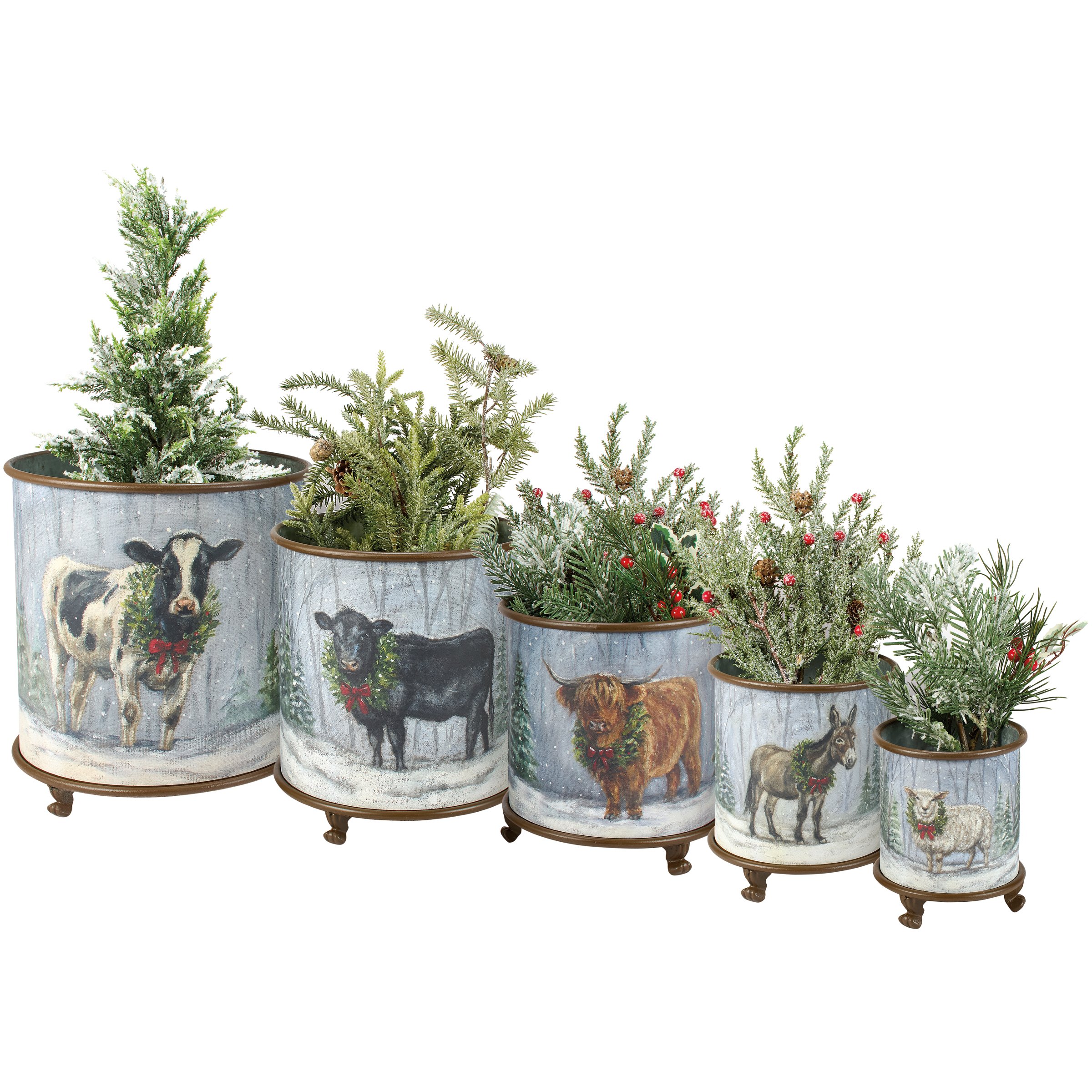 A set of metal planters from our Christmas Collection featuring 5 different size planters displaying charming winter scenes of farm animals wearing holiday wreaths in the snow replicated from original artwork painted onto burlap canvas, giving the art a unique depth and texture. Seasonal planters also feature brown metal rims and bases with rustic clawfoot accents. Our Snowy Animals planter set is designed to free stand on flat surface for display and is perfect for placing winter plants or household items. Greenery pictured not included. A set of rustic Christmas home accents perfect for seasonal decorating.