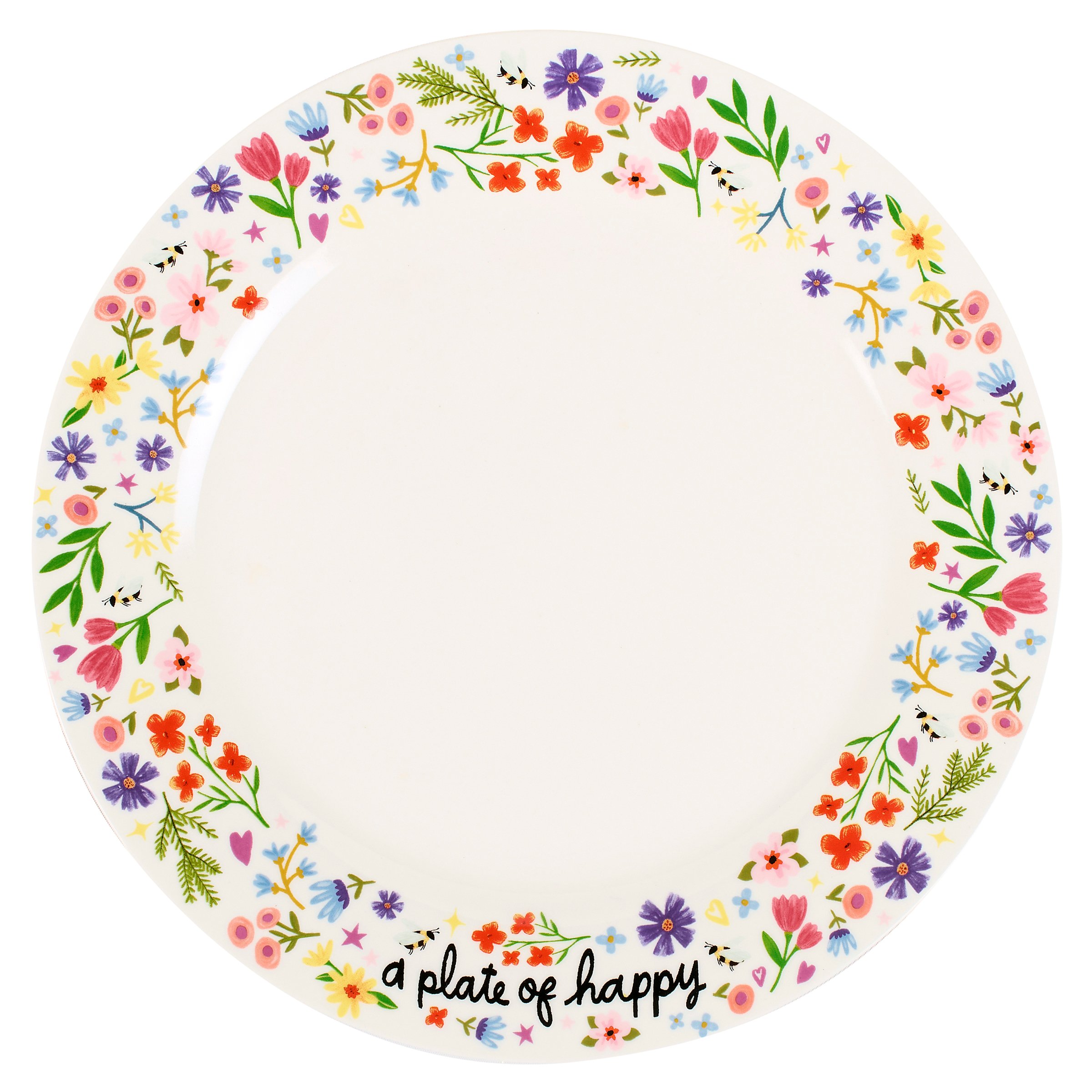A stoneware plate from our Inspiration & Blooms Collection displaying vibrant hand illustrated florals along the rim of the plate with an inspirational sentiment that reads "A Plate Of Happy." Our A Plate Of Happy plate is conveniently microwave, oven, dishwasher and food safe for easy use. A piece of inspirational dishware perfect for adding a heartwarming touch to gifting homemade treats.