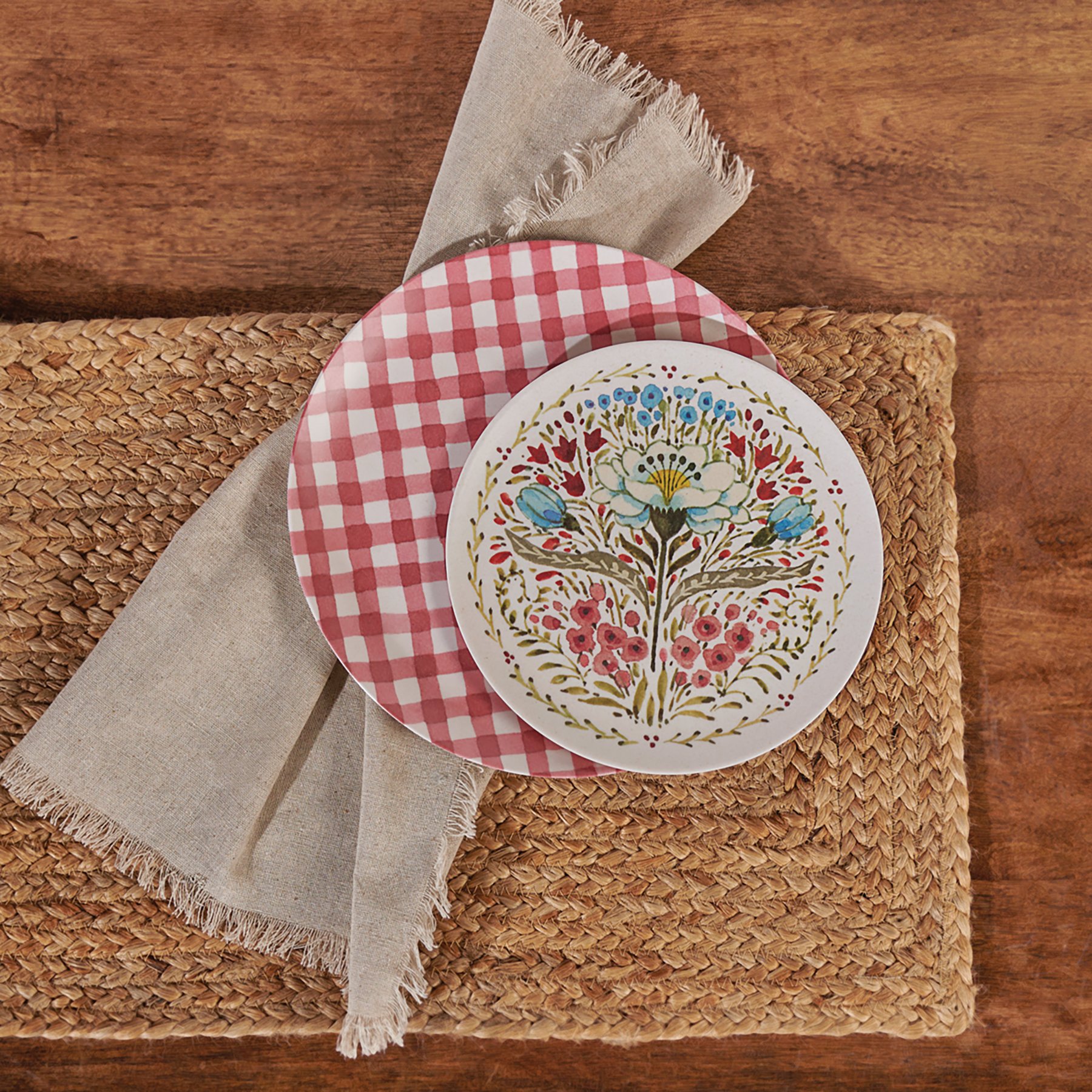 A large bamboo plate from our Farmhouse Collection displaying a hand painted red gingham design. Our Red Gingham large plate is dishwasher safe for convenient cleaning; made with bamboo fiber, melamine, and corn powder. Do not microwave. A rustic option for everyday tableware.