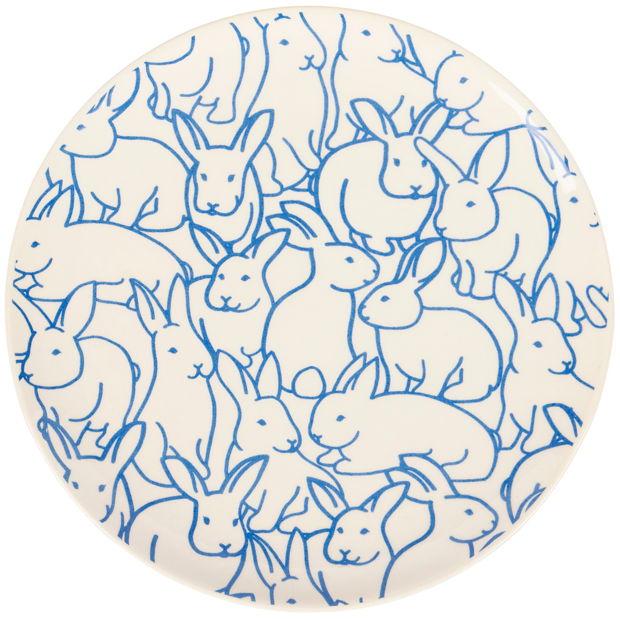 A lightweight, but durable ceramic small plate from our Easter & Spring Collection displaying a clean white glaze finish with a pattern of indigo blue rabbit outlines. Our small Rabbit Pattern plate is hand wash only. A piece of charming tableware perfect for spring gatherings.
